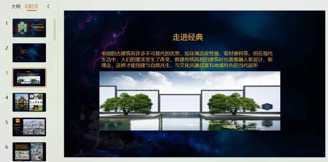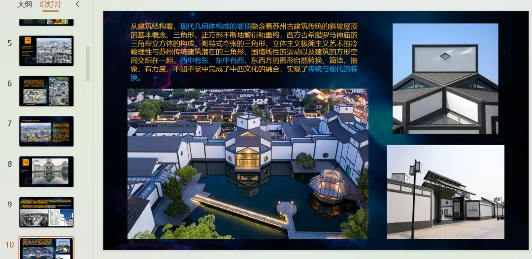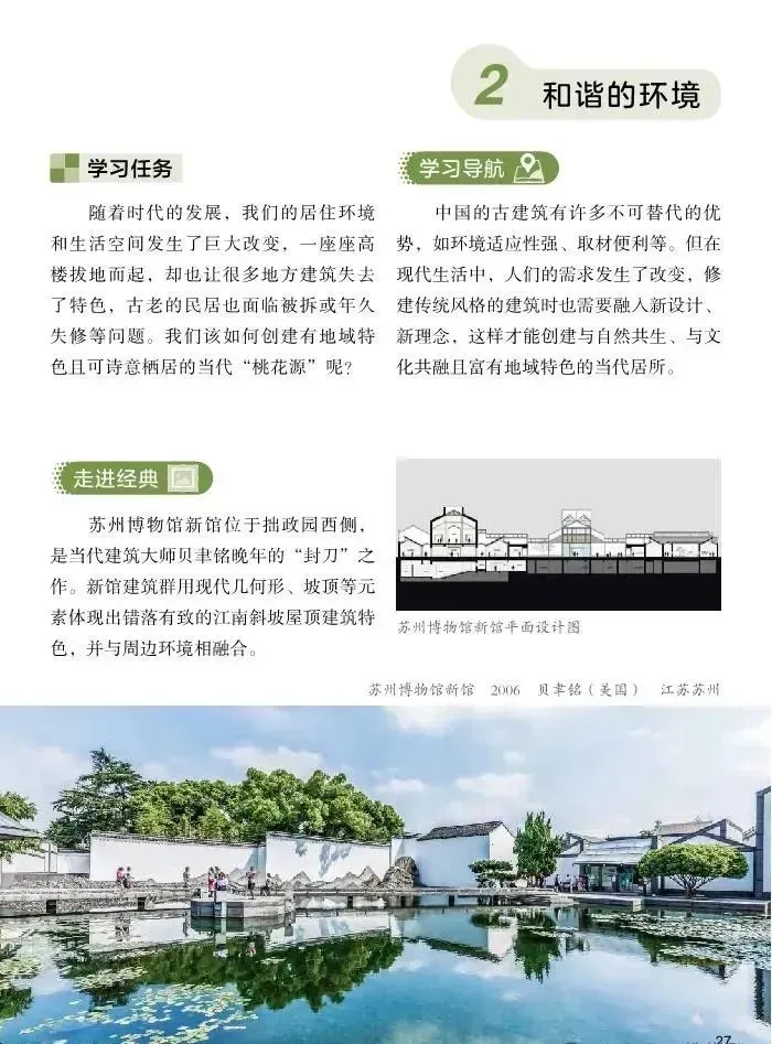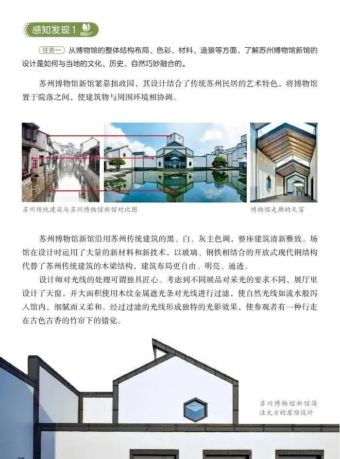 视频展示:播放苏州博物馆新馆与拙政园融合的航拍画面,引导学生思考“传统如何对话现代”。