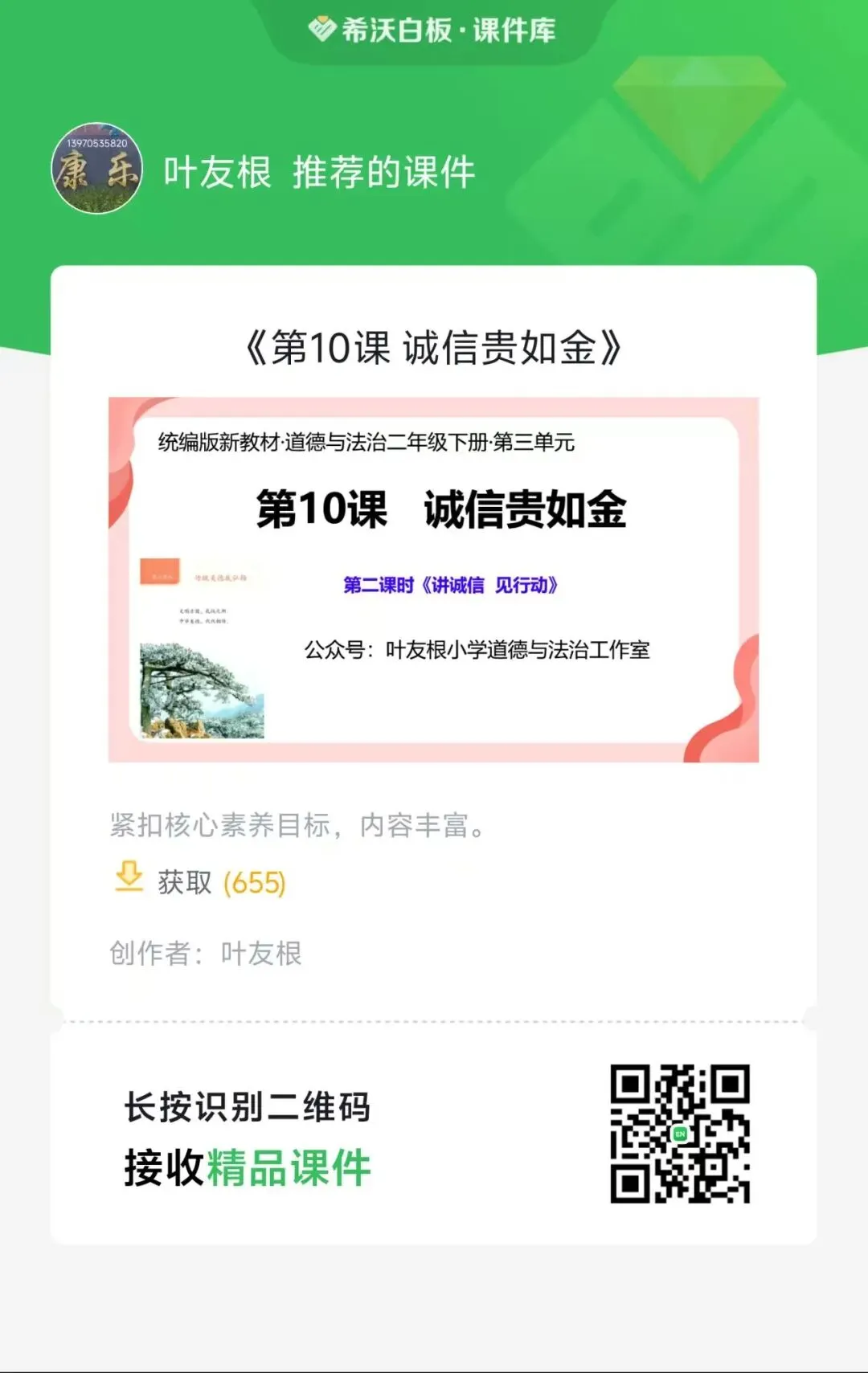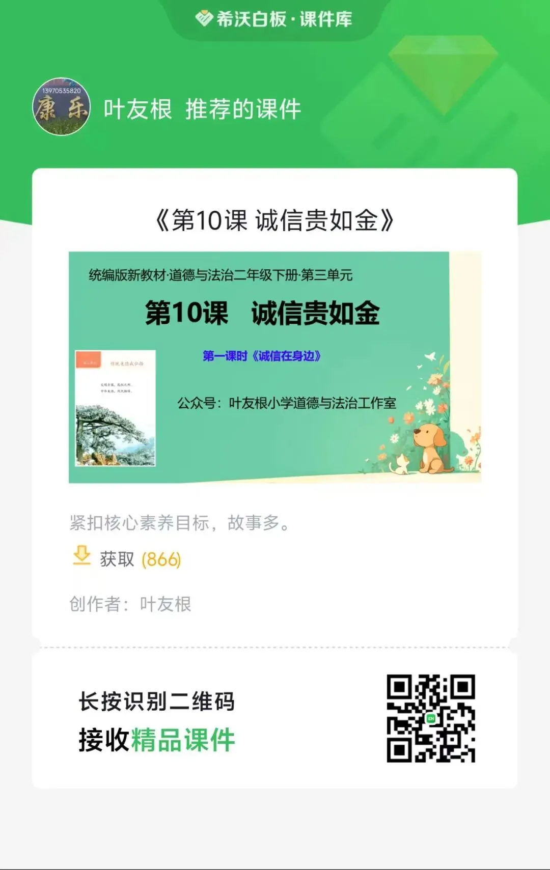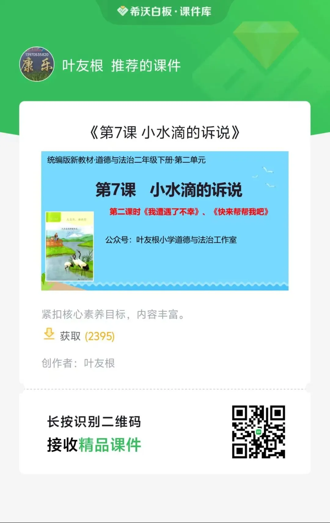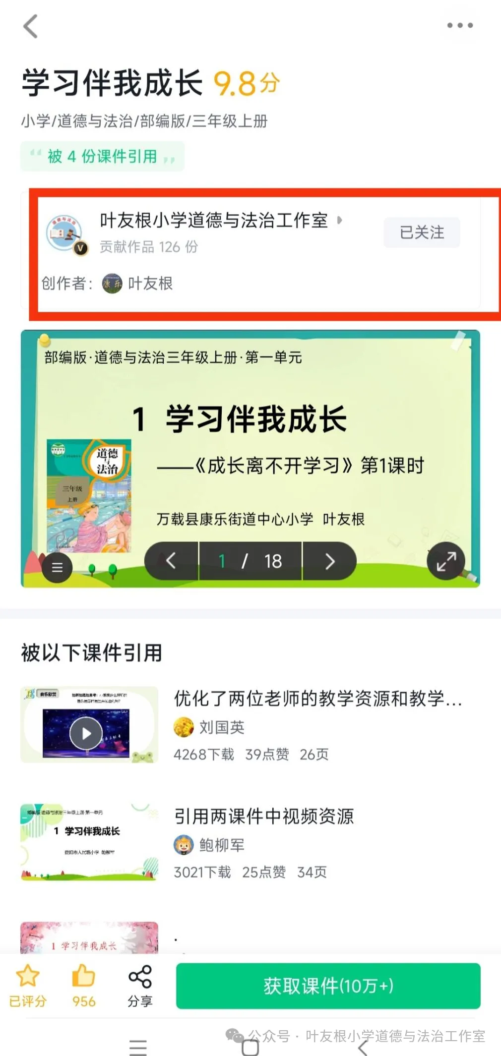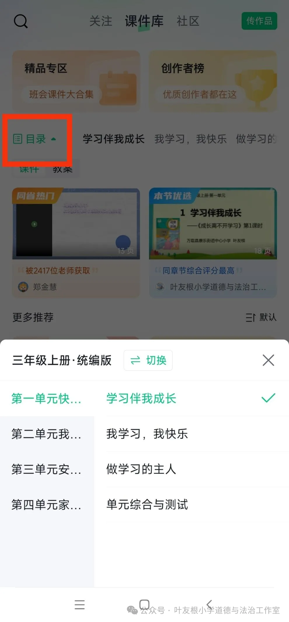 二是在手机或电脑直接下载希沃白板APP。进入页面,找到最下方的“课件库”,“课件库”左上角有个“目录”,旁边有个倒三角形,点击三角形可以切换自己需要的版本、学科学段、单元课题等。点击看到的“叶友根小学道德与法治”课件进入,就能看到叶友根小学道德与法治工作室,再点击关注进入,工作室所有资源都能看到并免费下载。