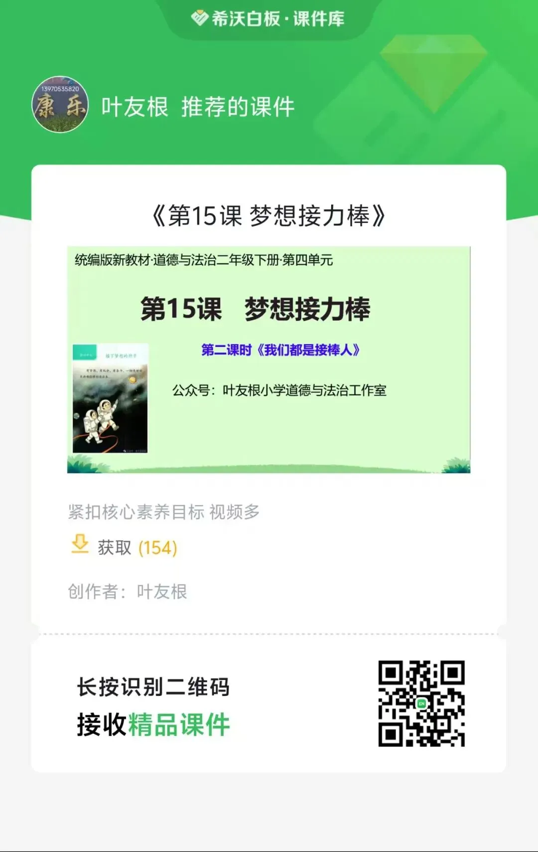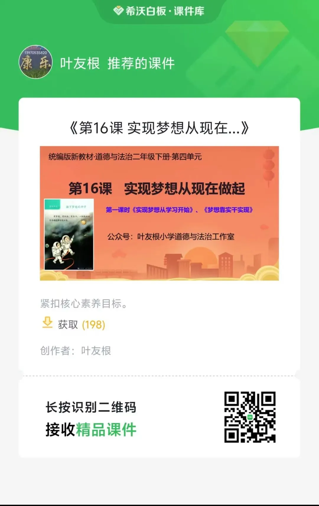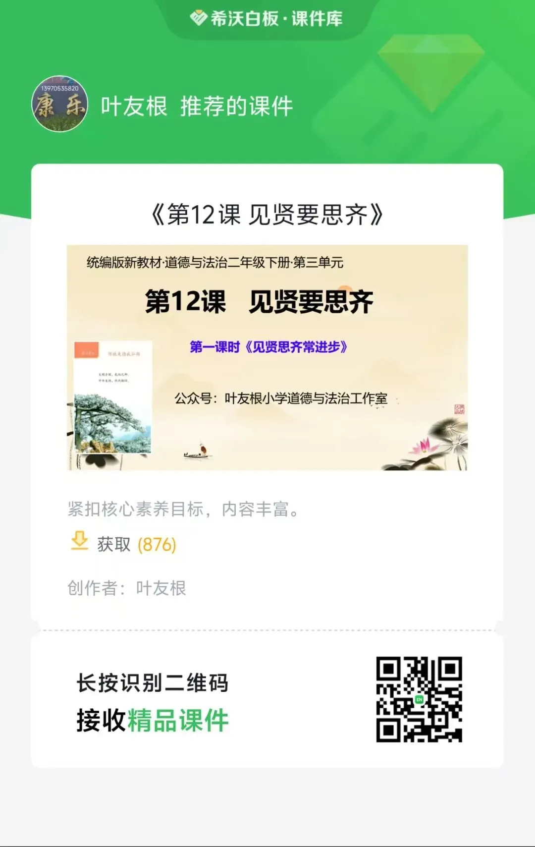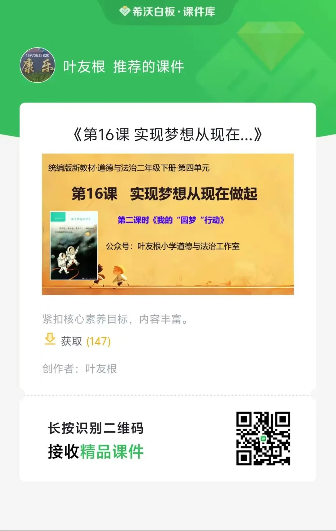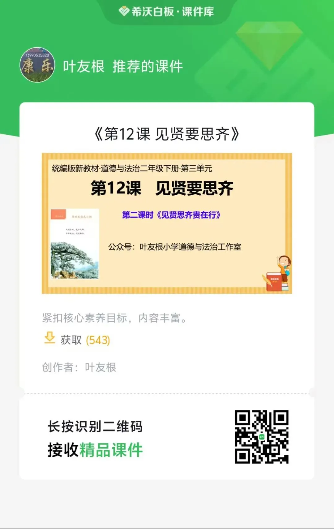 二是在手机或电脑直接下载希沃白板APP。进入页面,找到最下方的“课件库”,“课件库”左上角有个“目录”,旁边有个倒三角形,点击三角形可以切换自己需要的版本、学科学段、单元课题等。点击看到的“叶友根小学道德与法治”课件进入,就能看到叶友根小学道德与法治工作室,再点击关注进入,工作室所有资源都能看到并免费下载。
