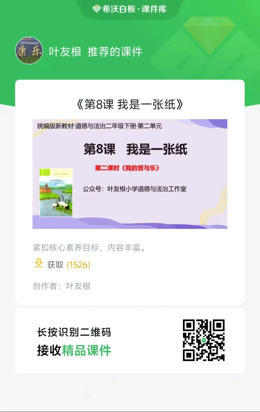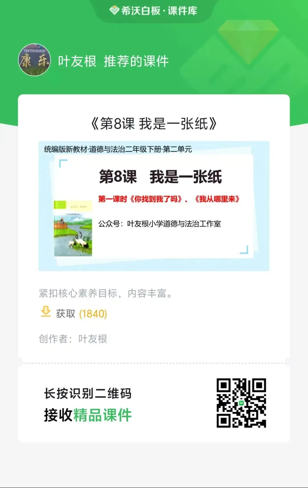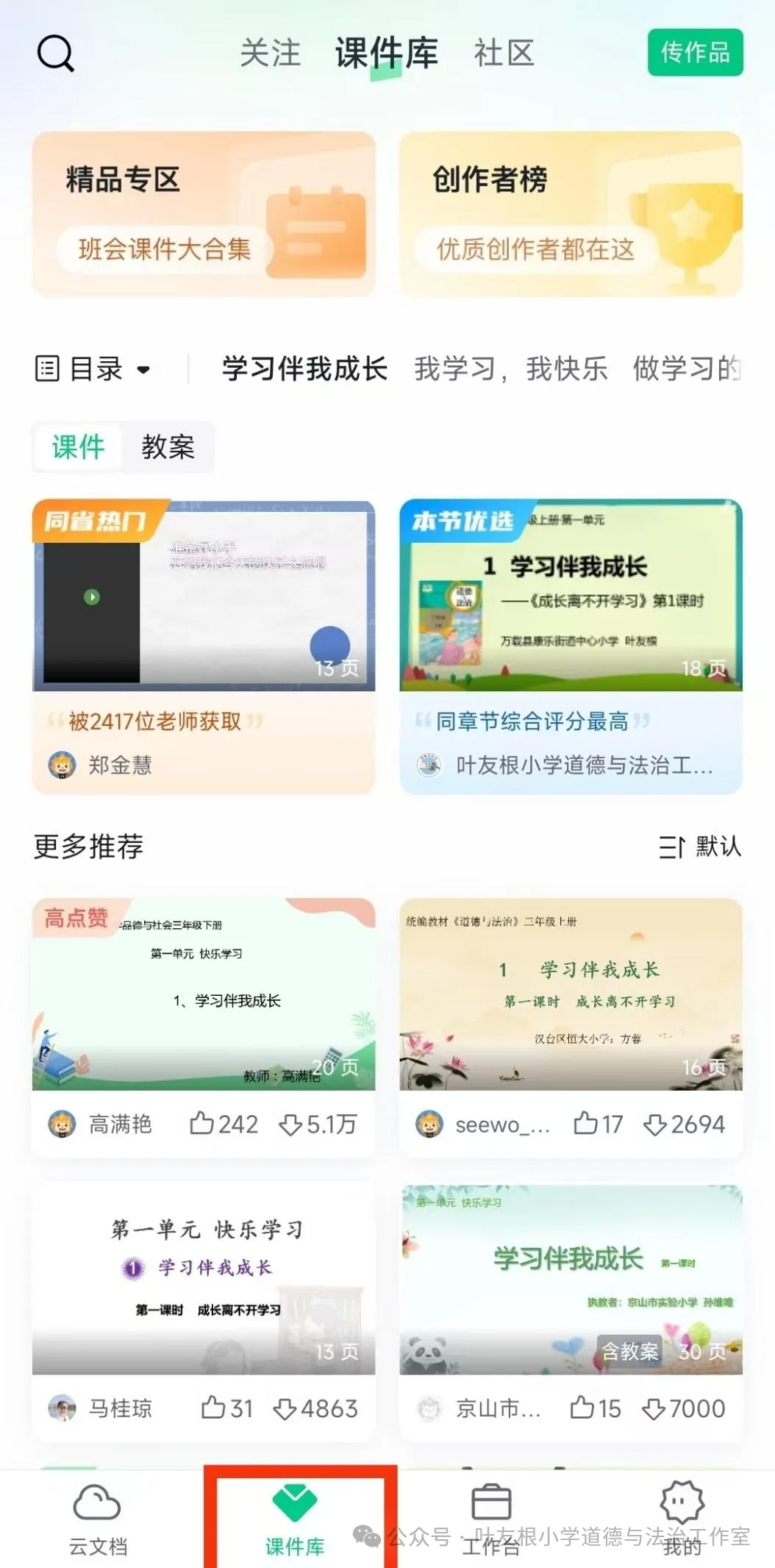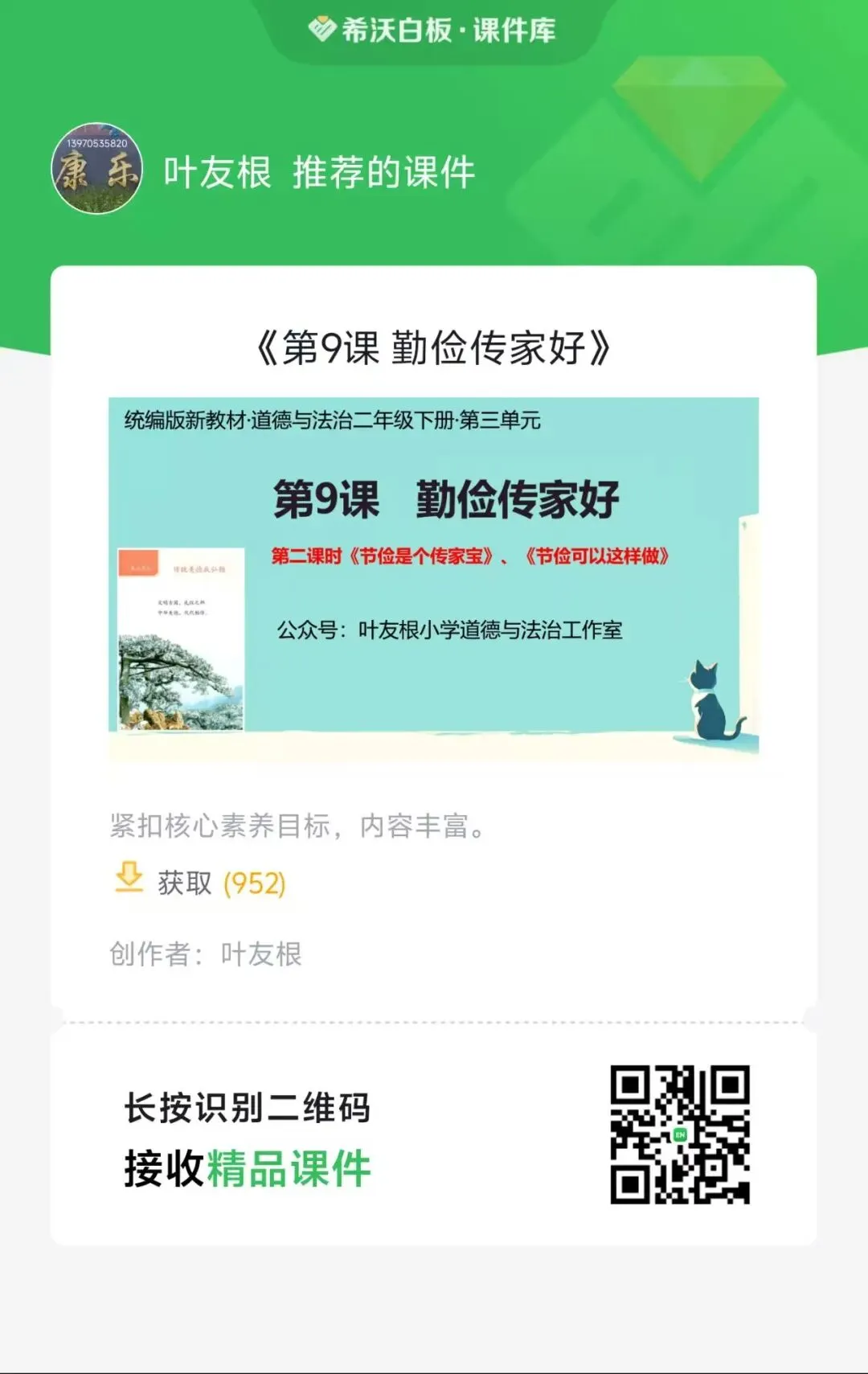 二是在手机或电脑直接下载希沃白板APP。进入页面,找到最下方的“课件库”,“课件库”左上角有个“目录”,旁边有个倒三角形,点击三角形可以切换自己需要的版本、学科学段、单元课题等。点击看到的“叶友根小学道德与法治”课件进入,就能看到叶友根小学道德与法治工作室,再点击关注进入,工作室所有资源都能看到并免费下载。