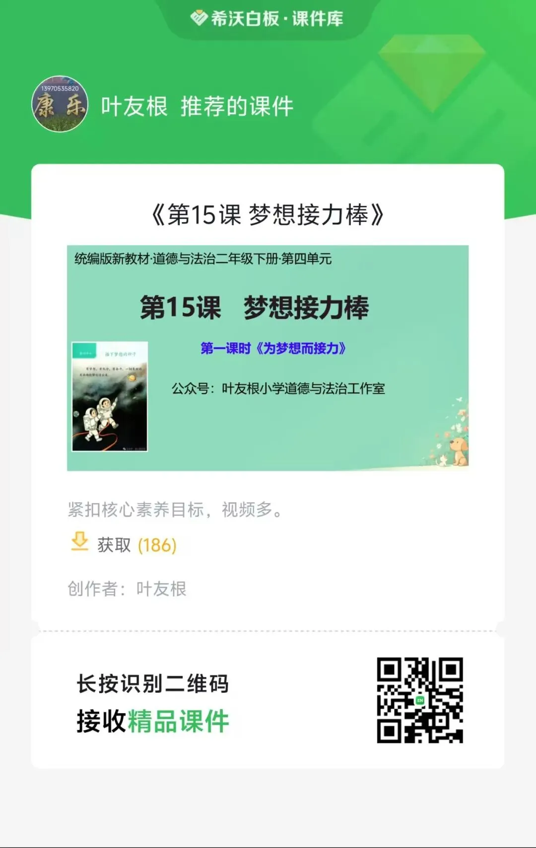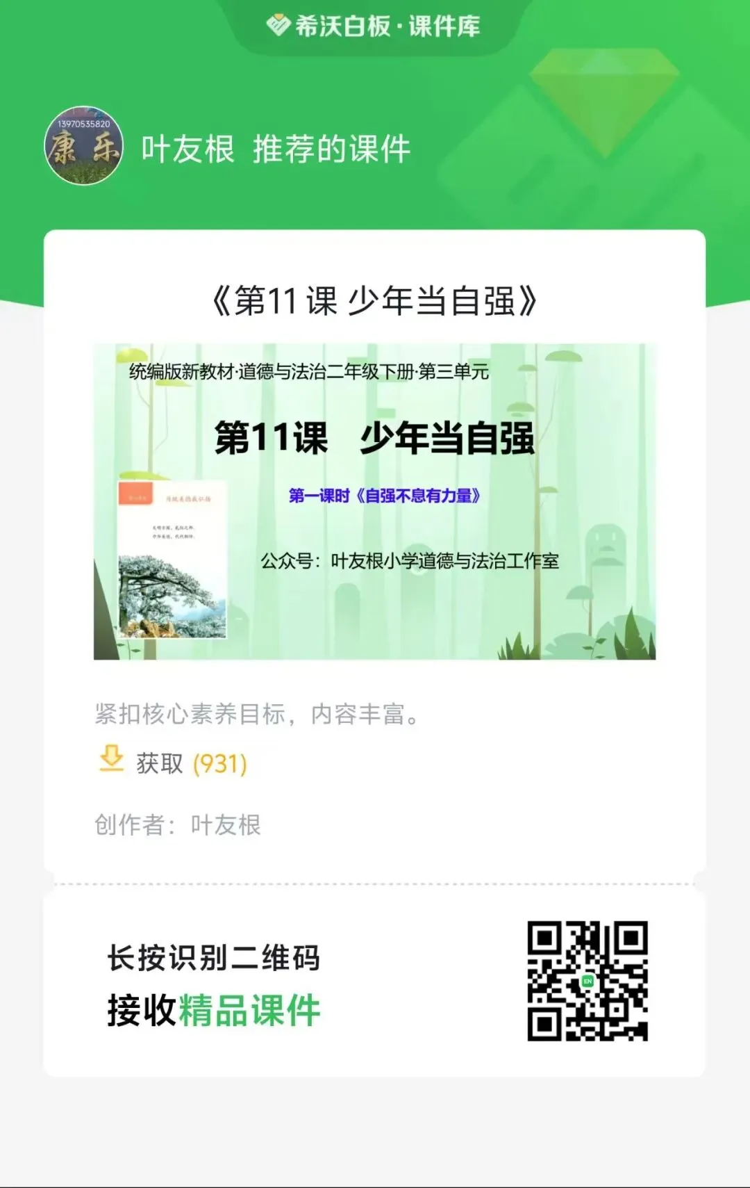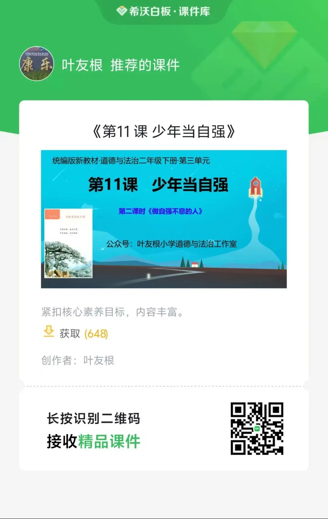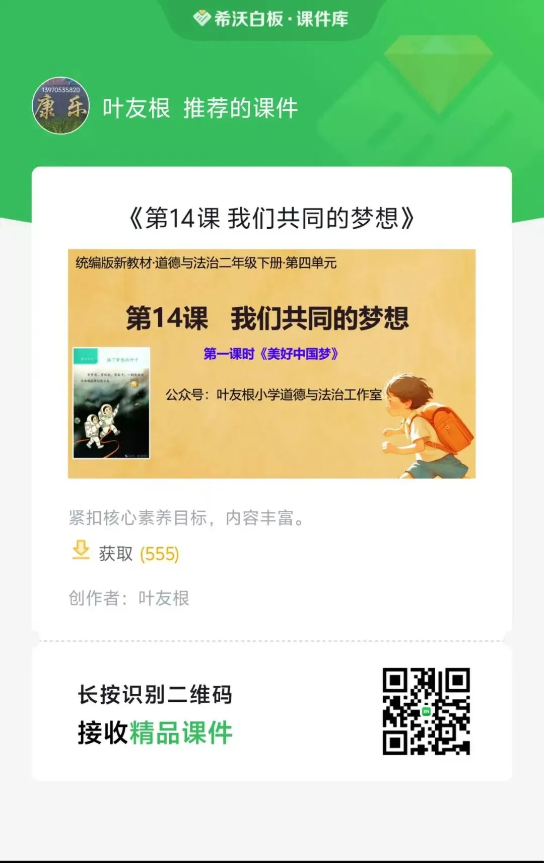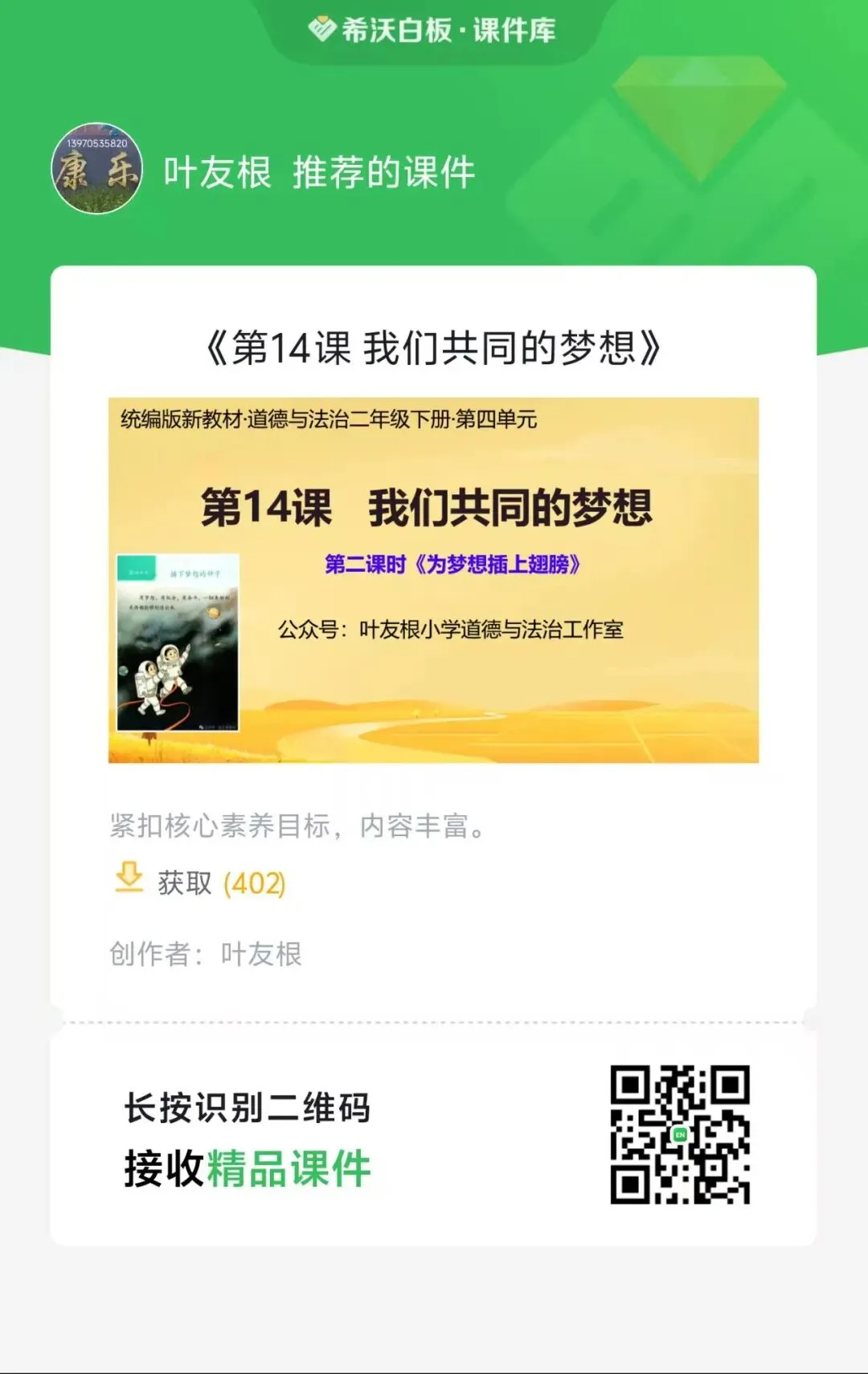 二是在手机或电脑直接下载希沃白板APP。进入页面,找到最下方的“课件库”,“课件库”左上角有个“目录”,旁边有个倒三角形,点击三角形可以切换自己需要的版本、学科学段、单元课题等。点击看到的“叶友根小学道德与法治”课件进入,就能看到叶友根小学道德与法治工作室,再点击关注进入,工作室所有资源都能看到并免费下载。
