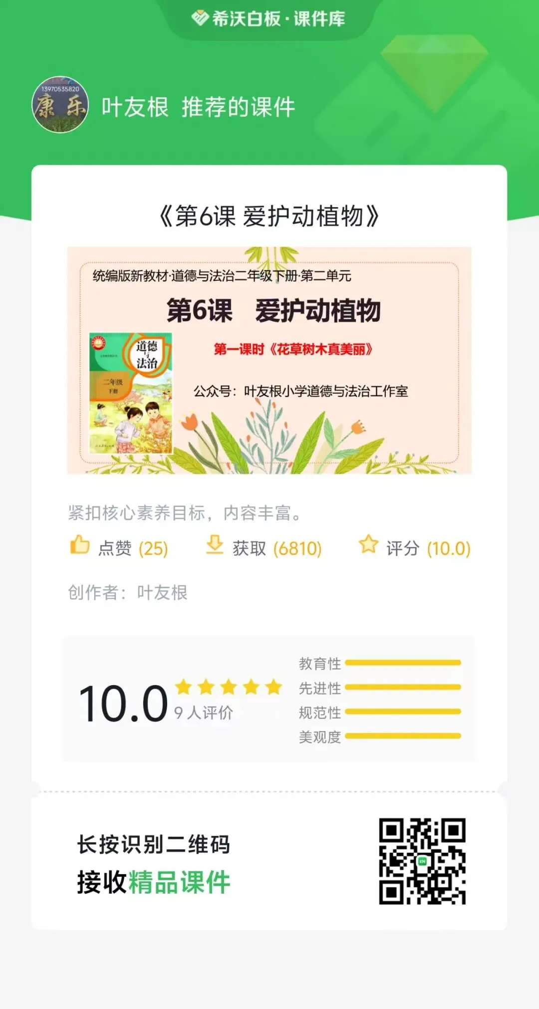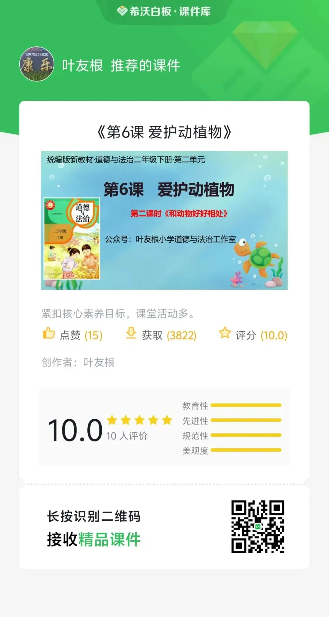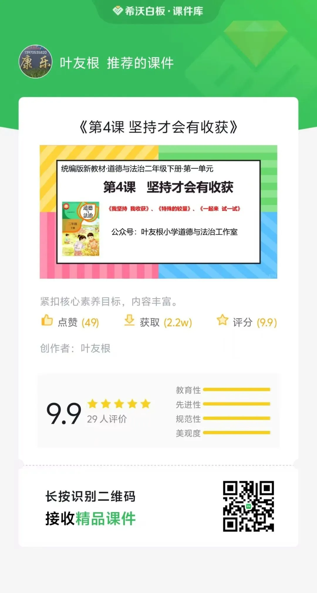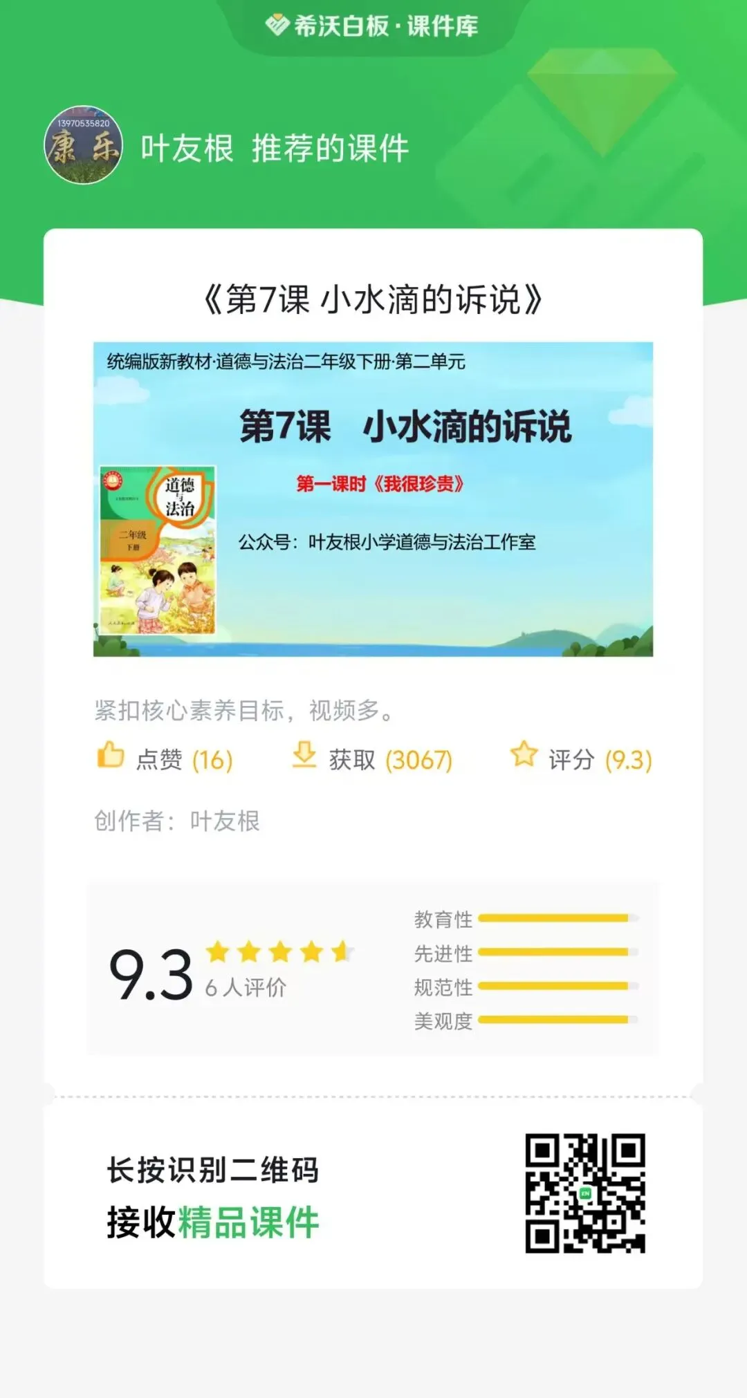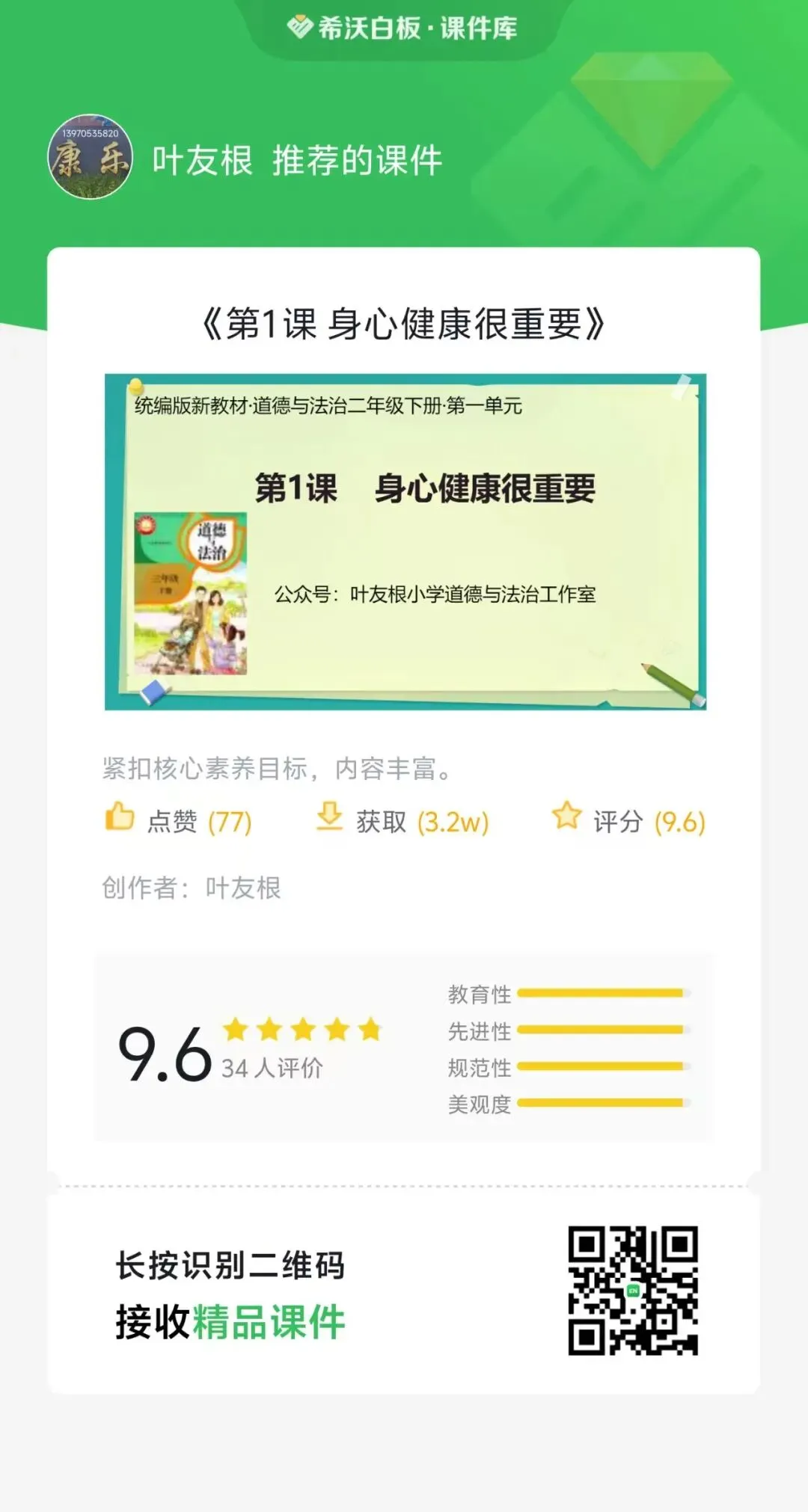 二是在手机或电脑直接下载希沃白板APP。进入页面,找到最下方的“课件库”,“课件库”左上角有个“目录”,旁边有个倒三角形,点击三角形可以切换自己需要的版本、学科学段、单元课题等。点击看到的“叶友根小学道德与法治”课件进入,就能看到叶友根小学道德与法治工作室,再点击关注进入,工作室所有资源都能看到并免费下载。
