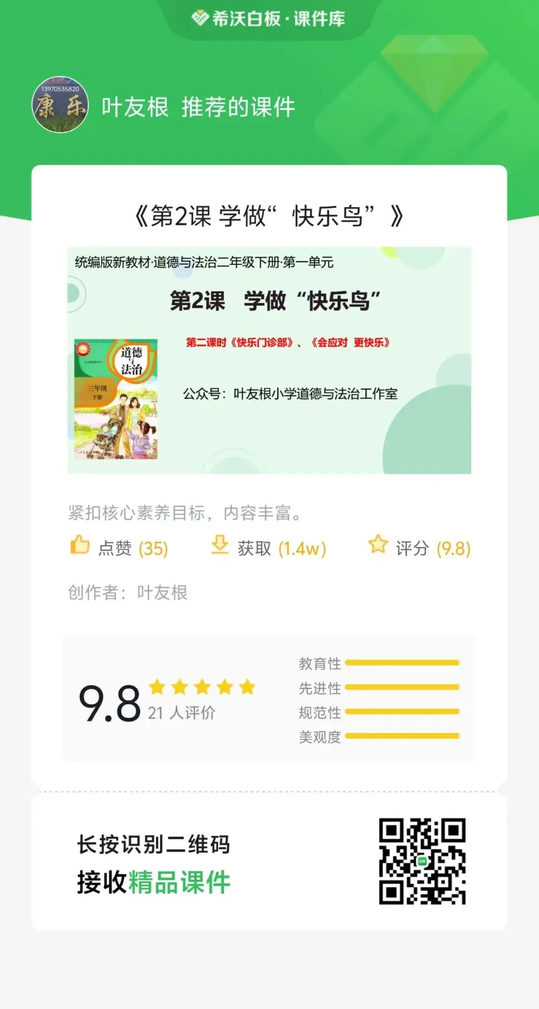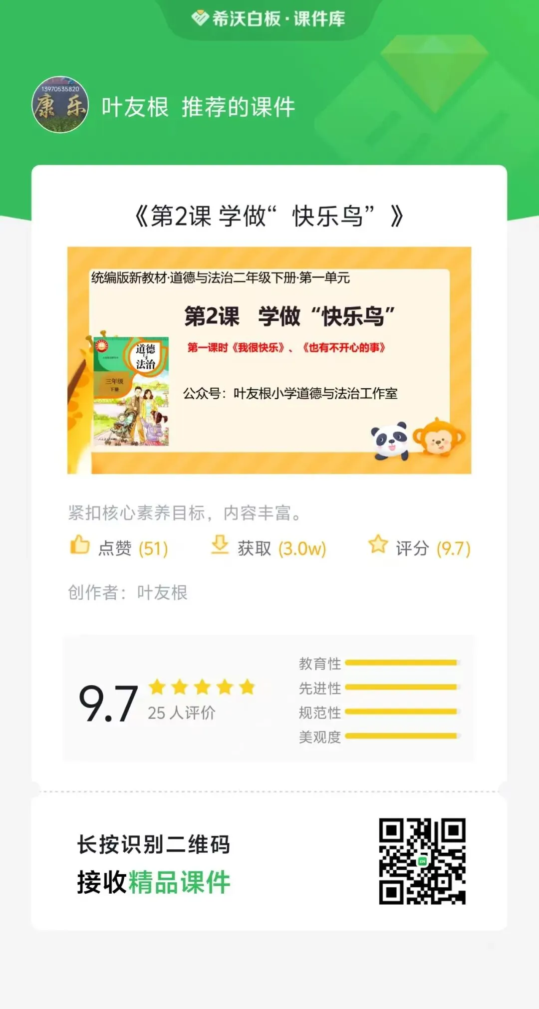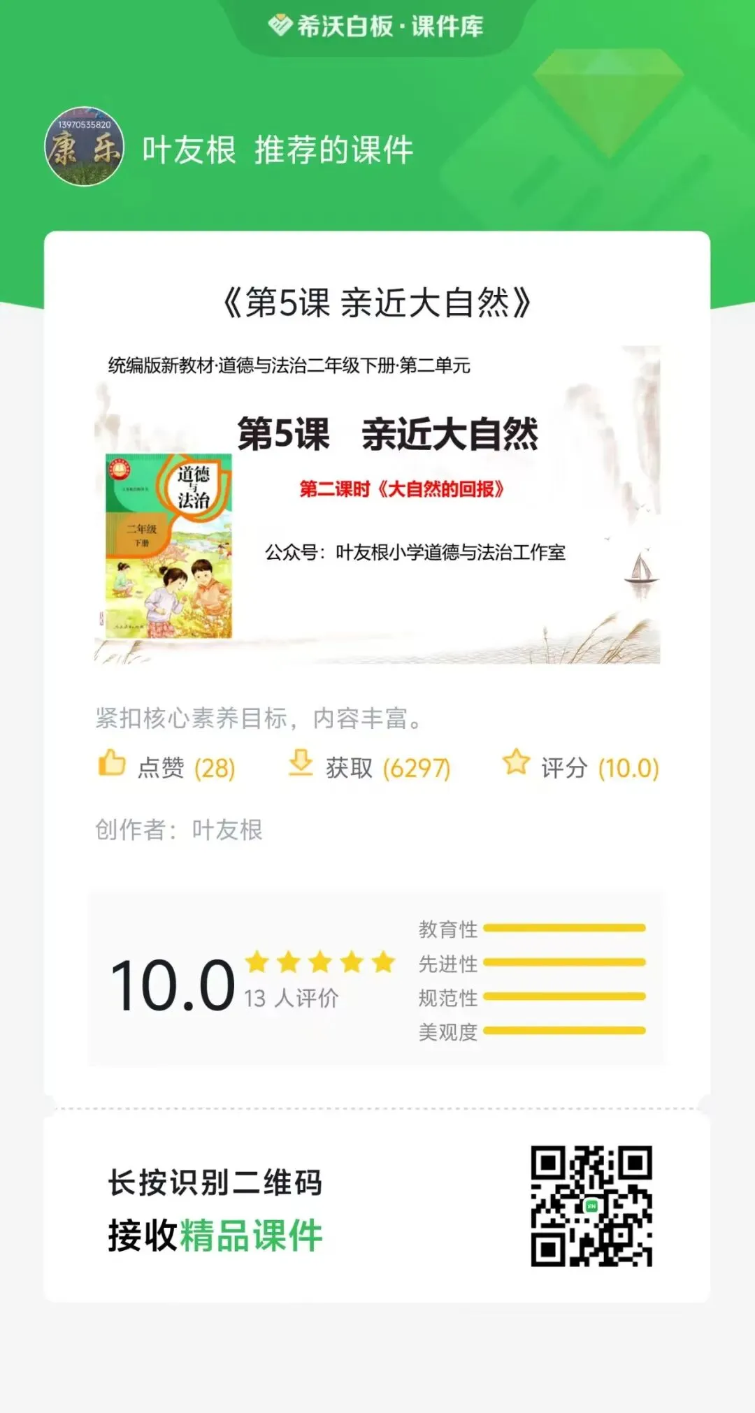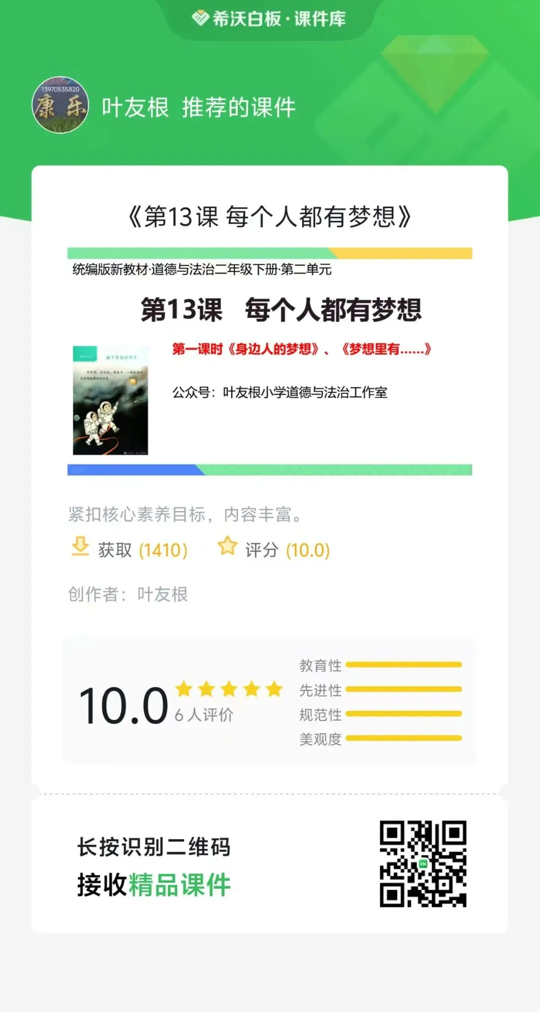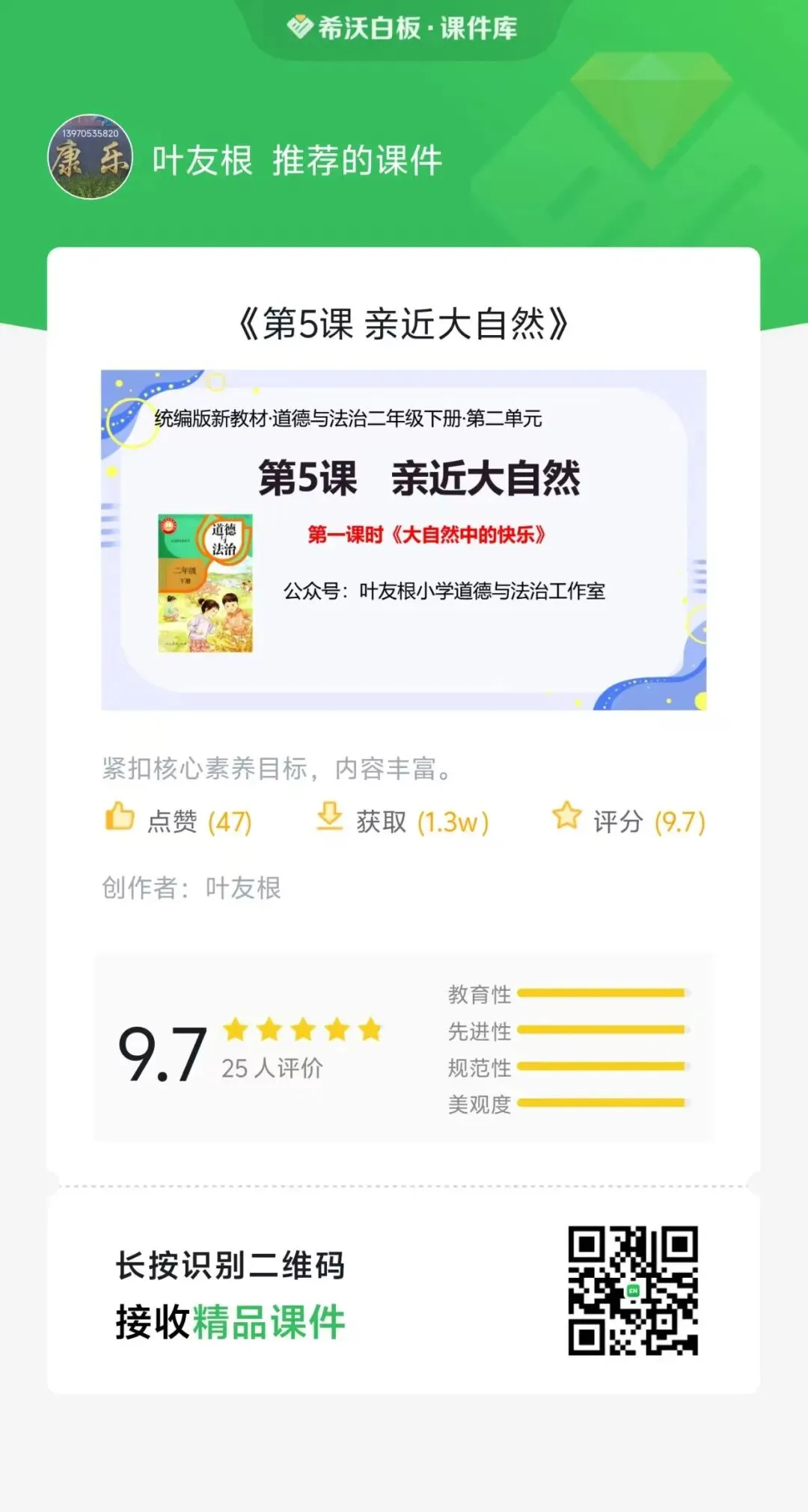 二是在手机或电脑直接下载希沃白板APP。进入页面,找到最下方的“课件库”,“课件库”左上角有个“目录”,旁边有个倒三角形,点击三角形可以切换自己需要的版本、学科学段、单元课题等。点击看到的“叶友根小学道德与法治”课件进入,就能看到叶友根小学道德与法治工作室,再点击关注进入,工作室所有资源都能看到并免费下载。