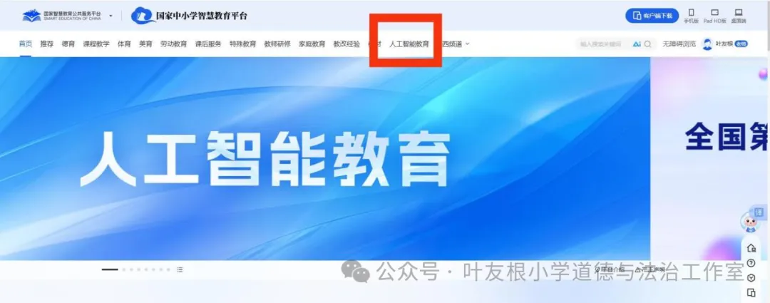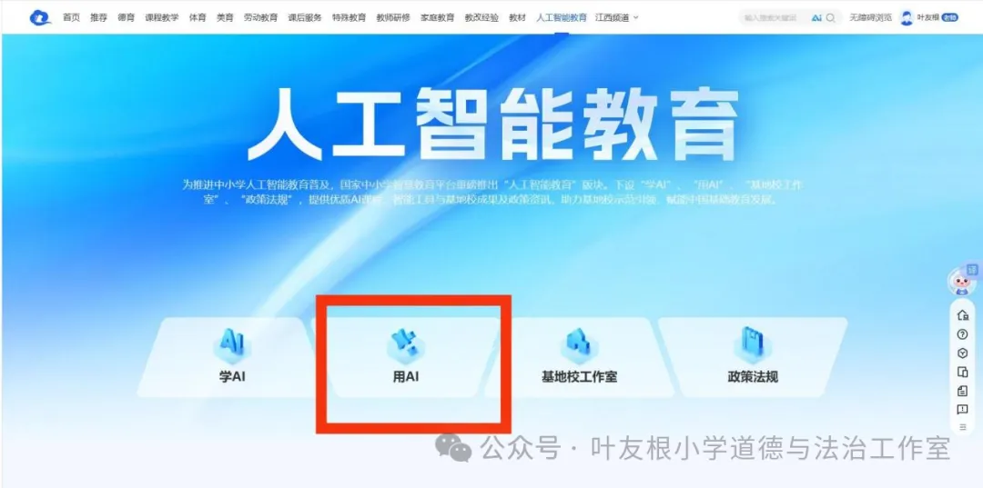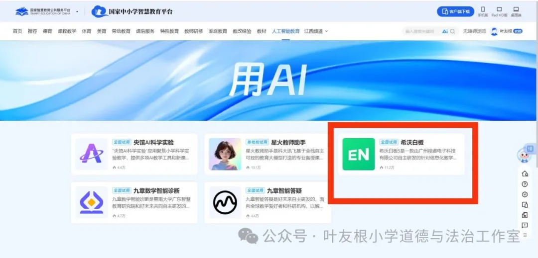 一是进入由教育部主办的国家中小学智慧教育平台(https://basic.smartedu.cn/),点击菜单栏“资源”,找到“人工智能教育”版块中的“用AI”,点击进入后就能找到希沃白板。
