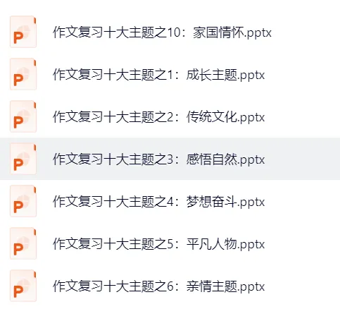 免费~中学语文十大主题作文复习PPT课件:成长主题 传统文化 感悟自然 梦想奋斗 平凡人物 亲情主题 青春主题 追忆乡情 自我风采 家国情怀