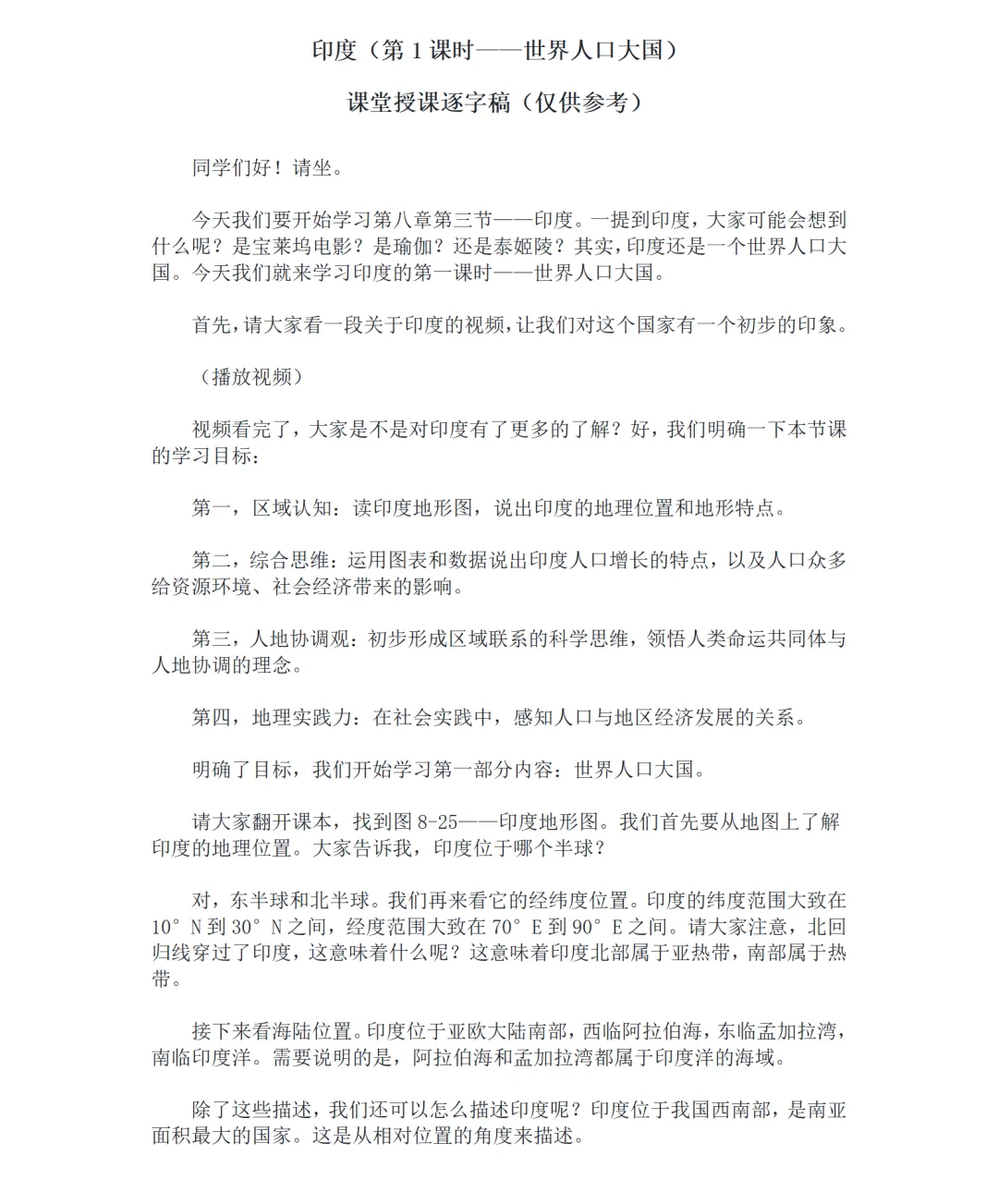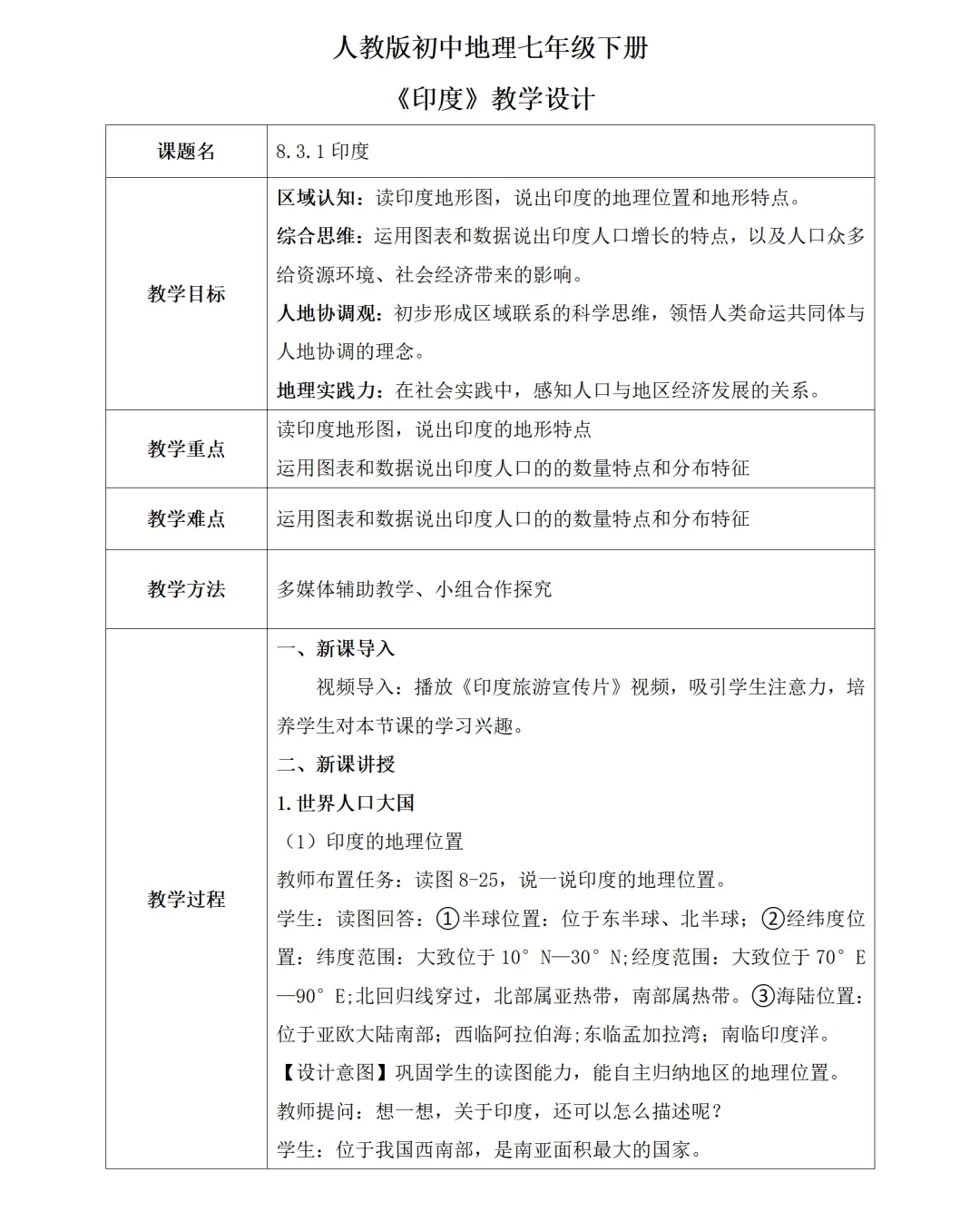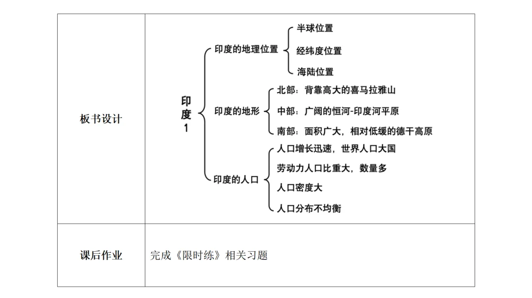 巧用旅游宣传片、人口增长视频等视觉素材,打破地理课堂的枯燥感,将抽象的区域地理知识与直观画面结合,既吸引学生注意力,又能让学生对印度形成直观的区域认知,降低知识理解难度。