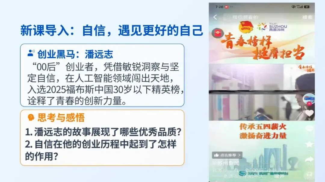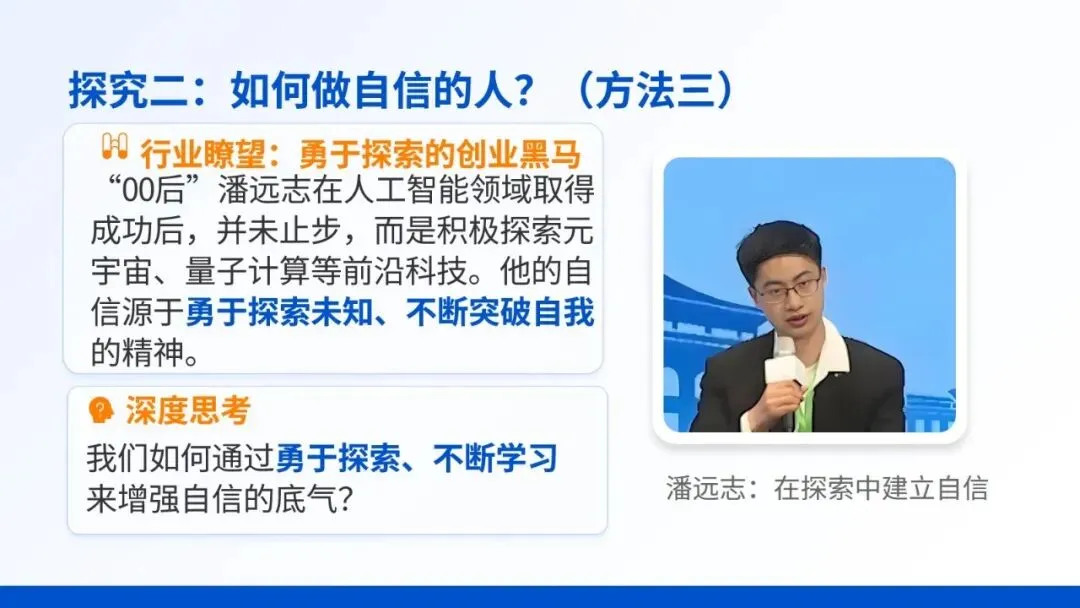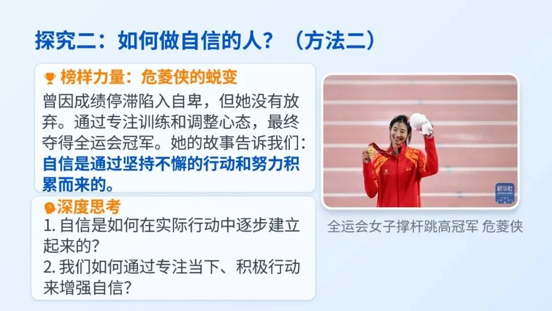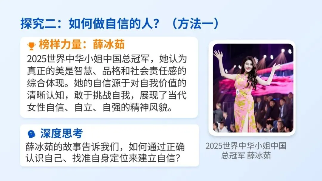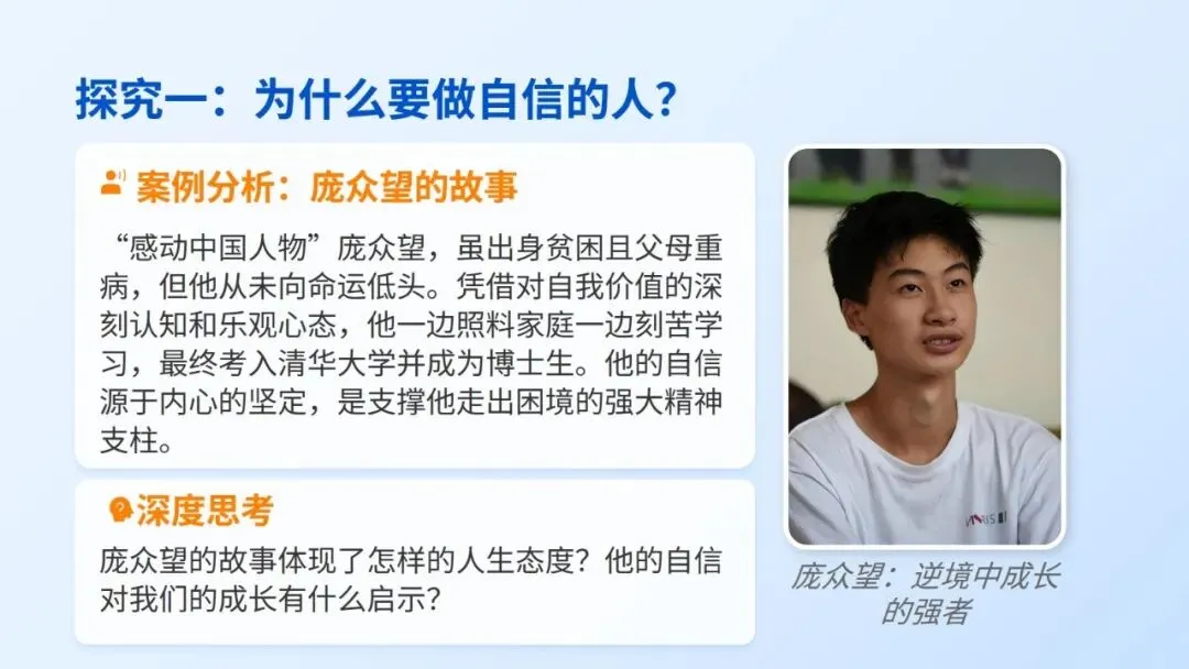 用同龄榜样贴近学生生活,快速激发学习兴趣;自然引出“自信”主题,为整课奠定情感与认知基础。