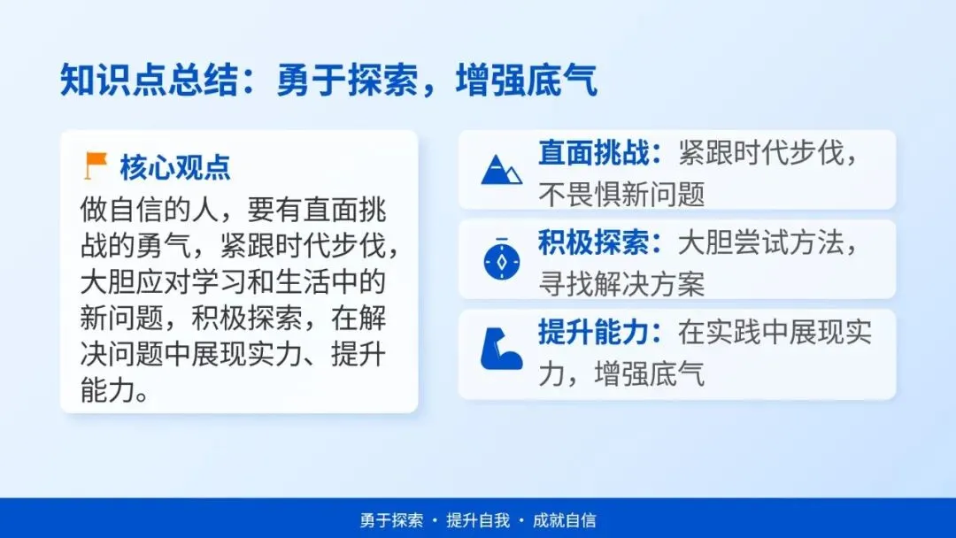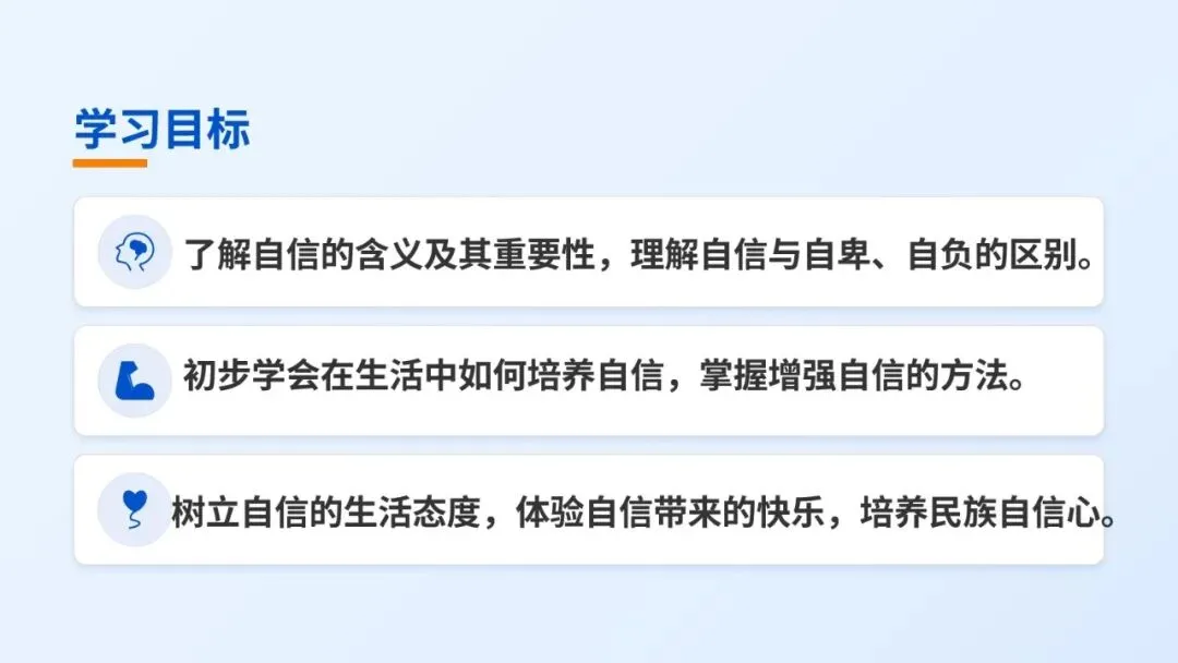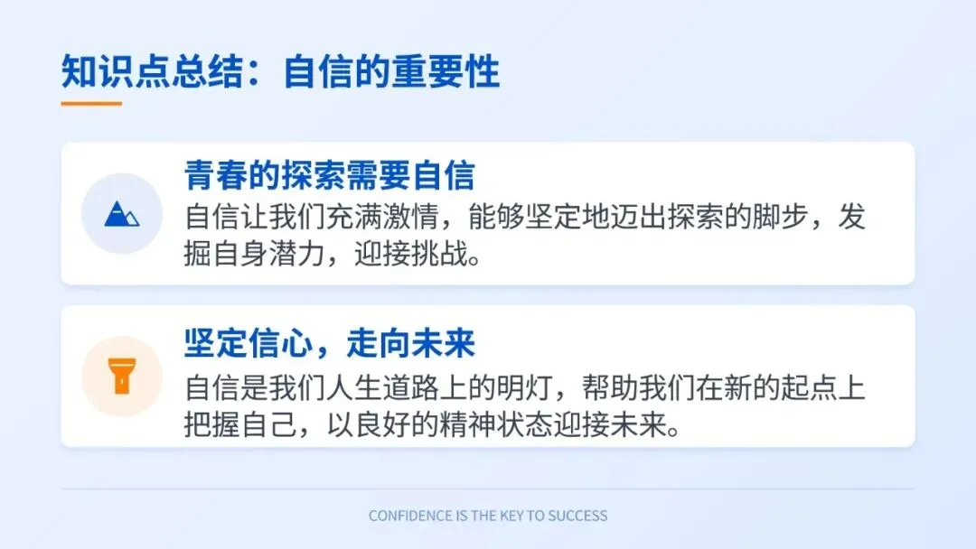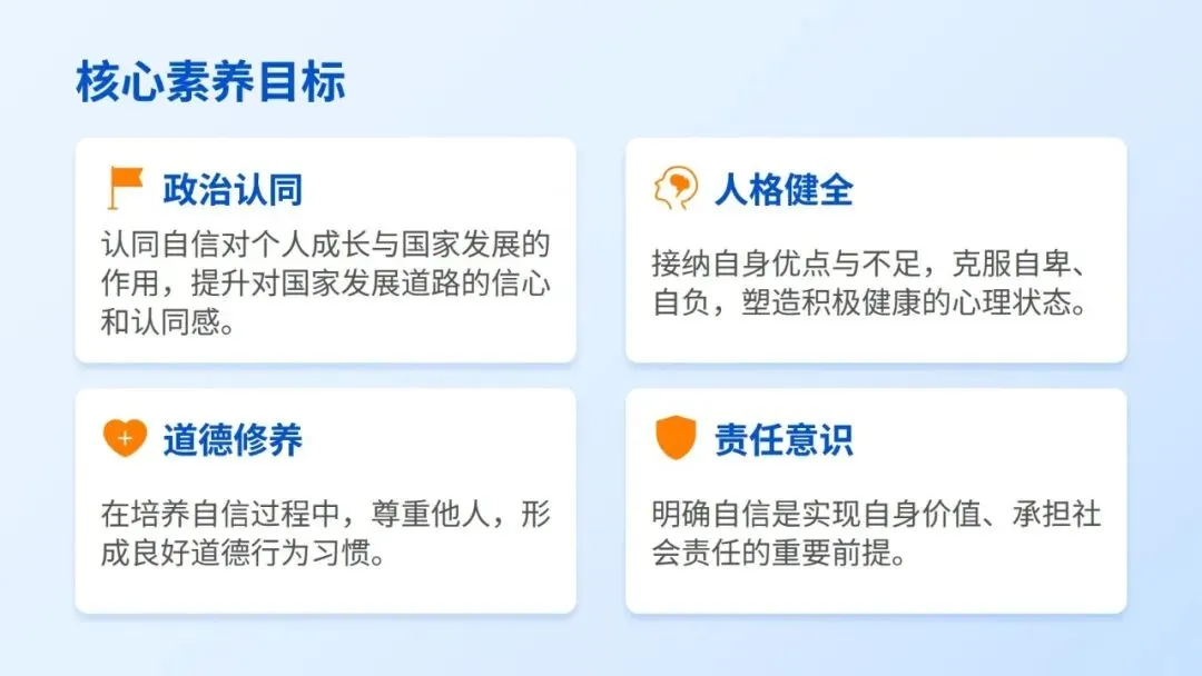 理解自信是实现自我价值、服务社会、承担时代责任的重要前提,主动以自信姿态面对学习与生活挑战。