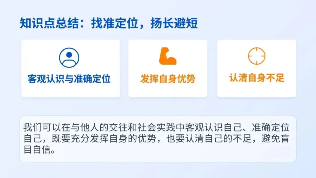 客观认识自我,发挥优势、正视不足,不盲目自大也不自我否定。