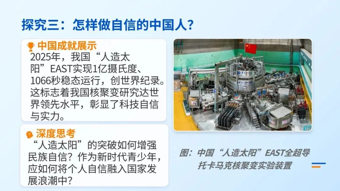1.展示课件中中国“人造太阳”EAST科技成就,提问: