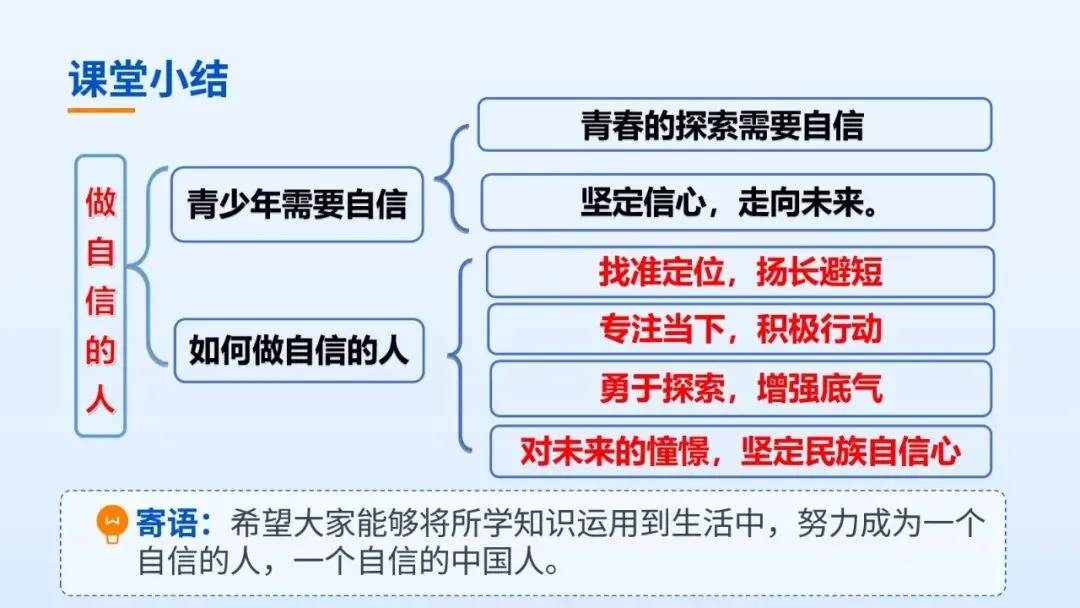 梳理知识、巩固落实;引导学生从课堂走向生活,把自信转化为实际行动;实现情感态度价值观的升华。