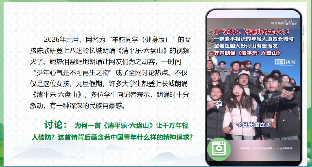 以青年学生朗诵《清平乐·六盘山》热点话题,让学生讨论诗歌背后的精神力量,激发学生的历史思考与情感共鸣,顺势引入新课,实现历史记忆与价值认同的自然衔接。