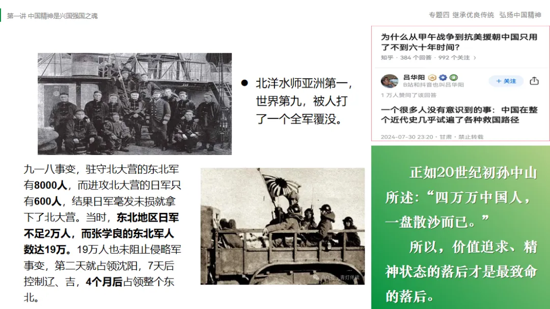 课堂教学围绕“什么是中国精神”“中华民族靠什么在历史洪流中屹立不倒、奋勇向前”“中国共产党人在百年奋斗中铸就了怎样的伟大精神”“为何实现中国梦必须弘扬中国精神”等核心问题展开,引导学生在追问与探究中深化理解。通过回顾中国人民的抗战历程,结合杨靖宇将军、刘老庄连等英烈事迹,帮助学生感悟中华民族在血与火的洗礼中孕育出的伟大精神力量。引导学生认识到,我们的胜利离不开亿万人民的顽强奋斗,离不开民族的创新创造,离不开团结一心的凝聚力量,更离不开中国共产党在民族危亡关头所发挥的中流砥柱作用。通过案例化讲授与价值引领相结合,促使学生在理解历史的同时,树立弘扬中国精神、担当时代使命的思想自觉。
