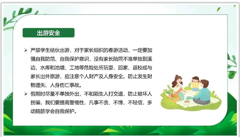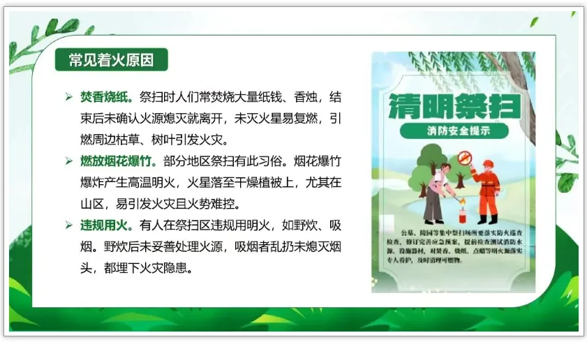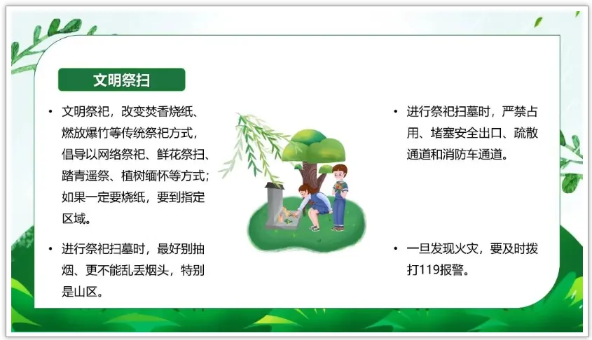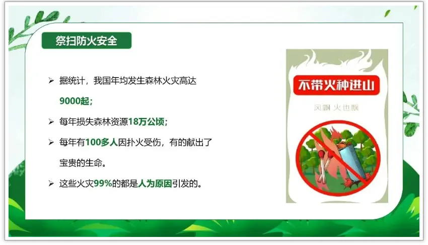 2.增强学生的安全意识,预防清明节期间可能发生的各类安全事故。文明祭祖,知道森林防火的重要性,要爱护森林。通过对火灾事件的了解,知道发生火灾的主要原因,提高学生的防火意识,使学生懂得溺水的主要原因和自救的方法,强化防溺水的意识。学习交通安全、饮食安全、居家安全、出游安全等相关知识。