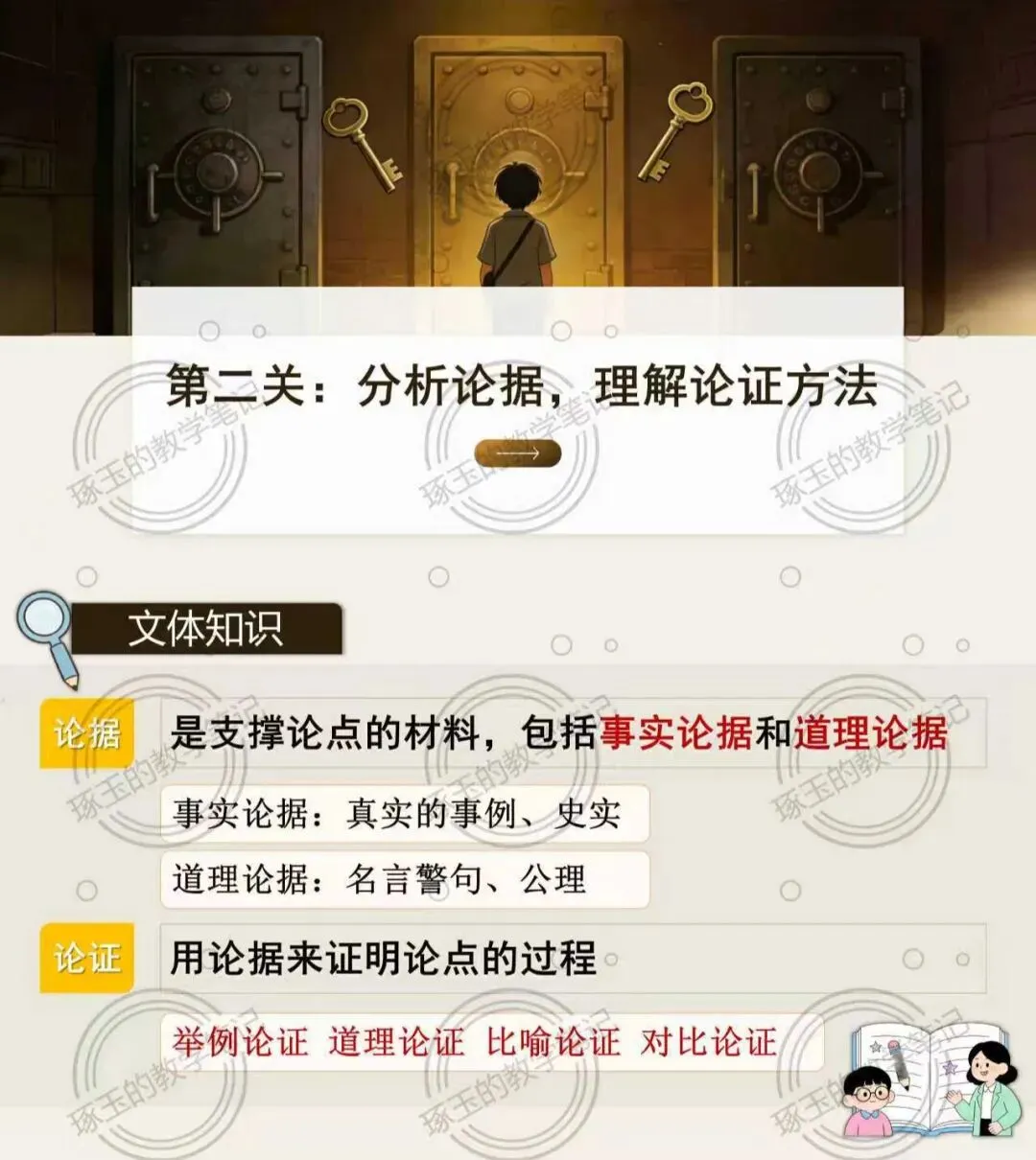 闯关目标:识别论据类型,分析论据与论点的关联,掌握论证方法及作用,解锁材料之钥