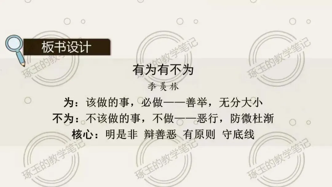 结合课文观点和生活抉择,提炼做到“有为有不为”的核心原则:明是非、辨善恶、有原则、守底线。