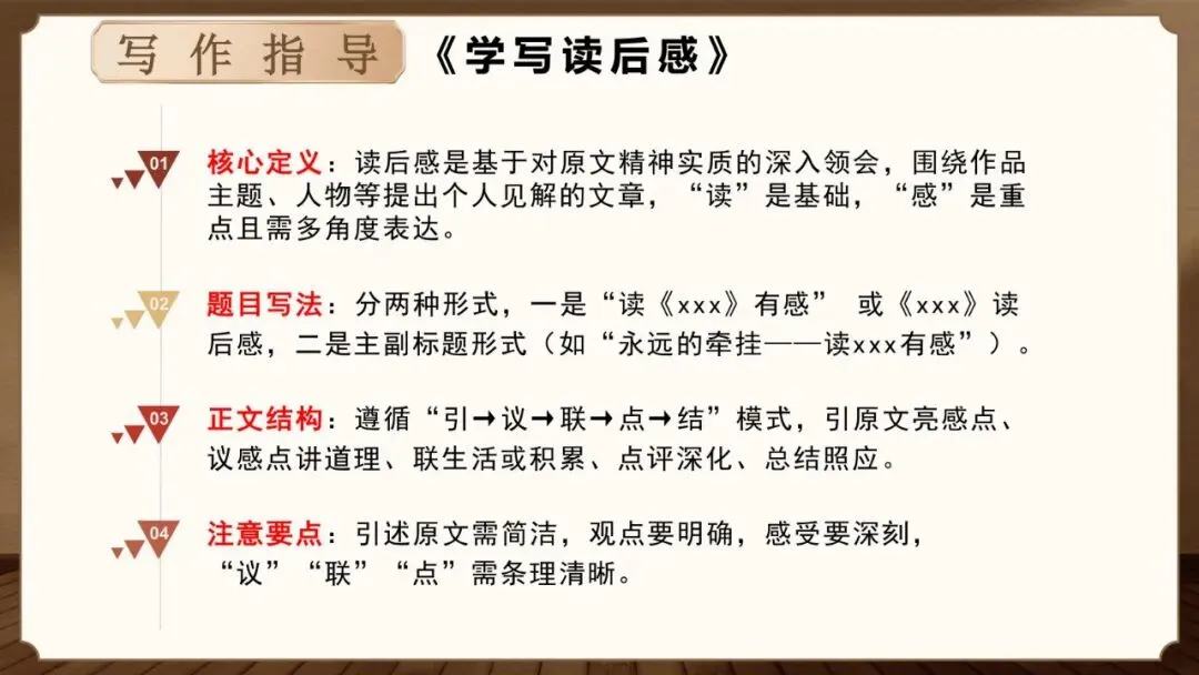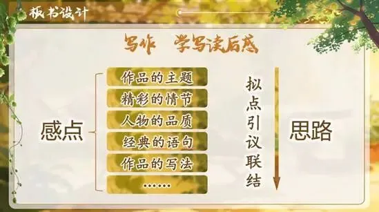 重点:学会从阅读材料中提炼感触点,掌握读后感"拟→点→引→议→联→结"的基本写法。