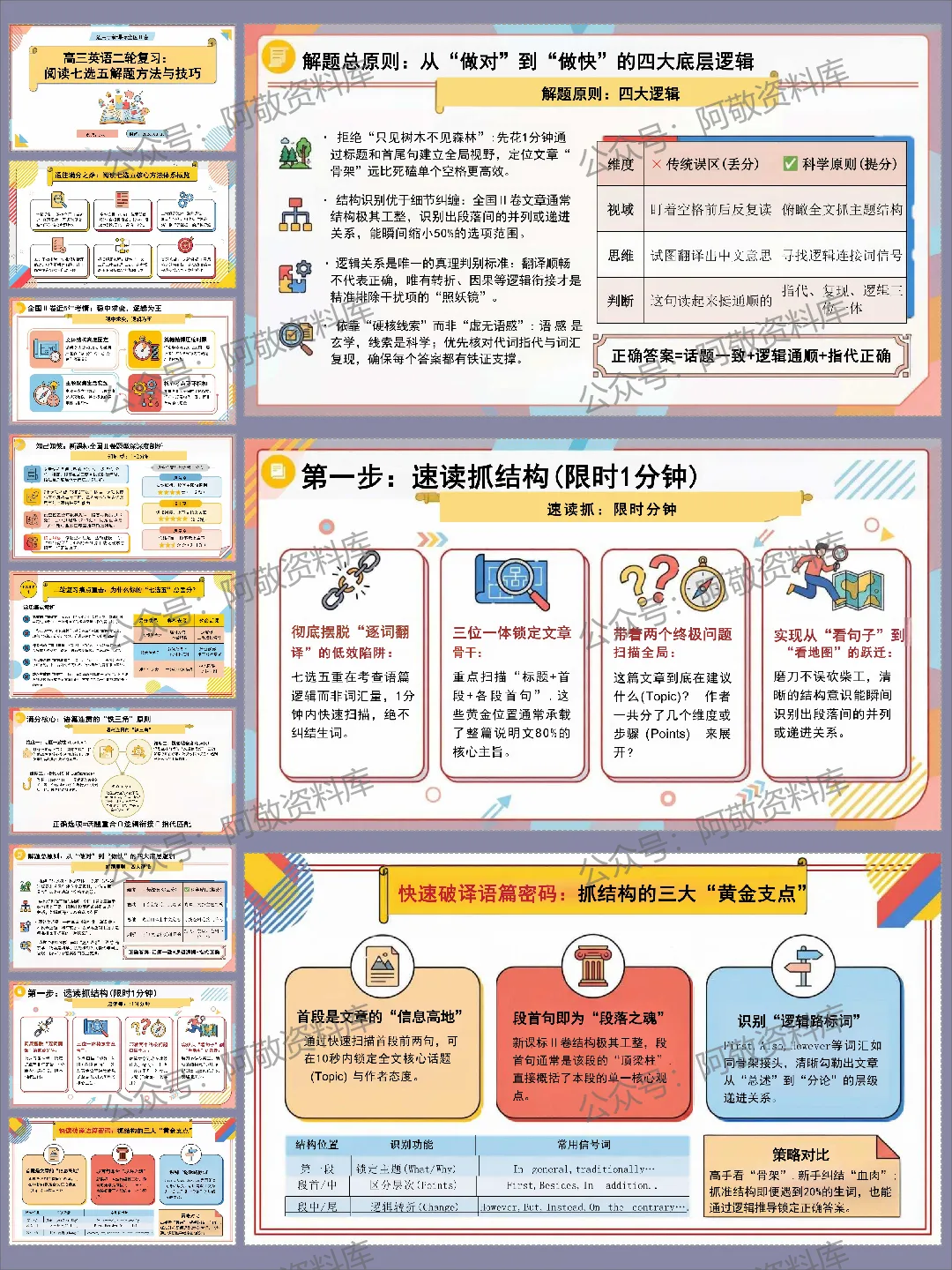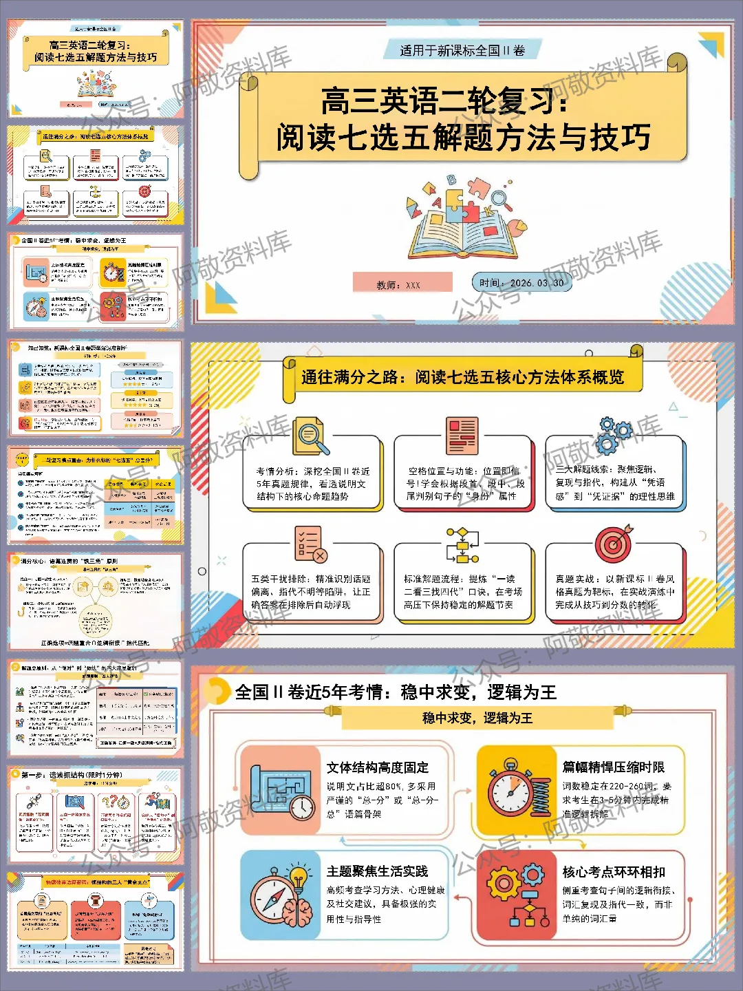 如何让学生在阅读七选五中脱颖而出,其实是有方法和技巧的,在二轮复习上,用上这样的一份课件,能取到事半功倍的效果。