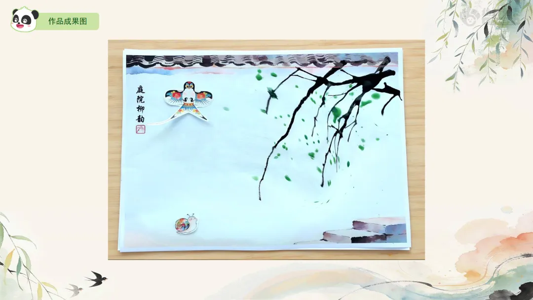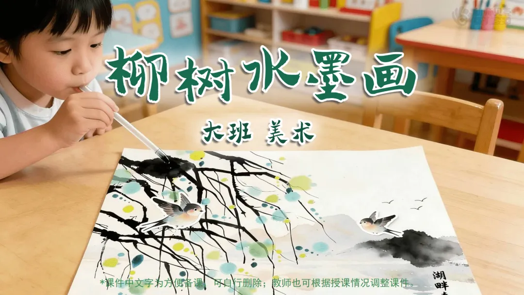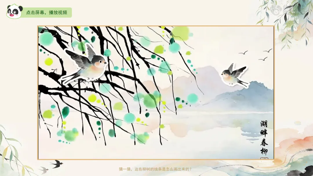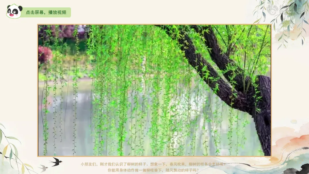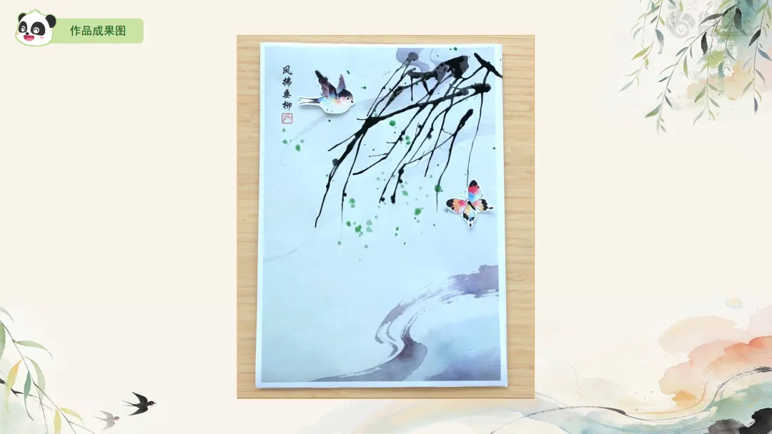 Ø活动建议: 1.教师可为幼儿作品拍照,并现场使用AI生成柳枝随风摇曳的动态效果进行展示,以增强其对画面动态美的体验。2.生成指令可参考:生成一段童趣水墨动画:画面中,柳枝柔软垂下,在春风中轻盈摇曳;树下的小燕子翩翩飞舞,蝴蝶翅膀微微扇动,画面整体充满天真活泼的动感,循环播放。