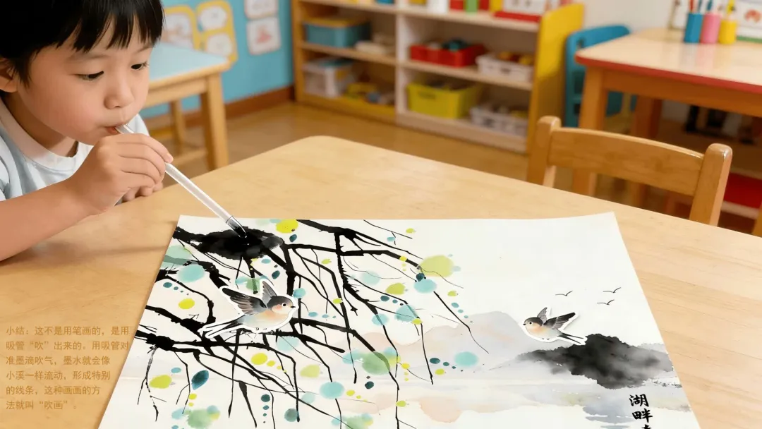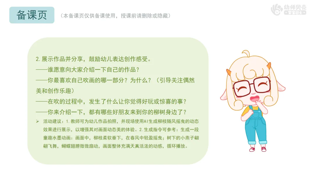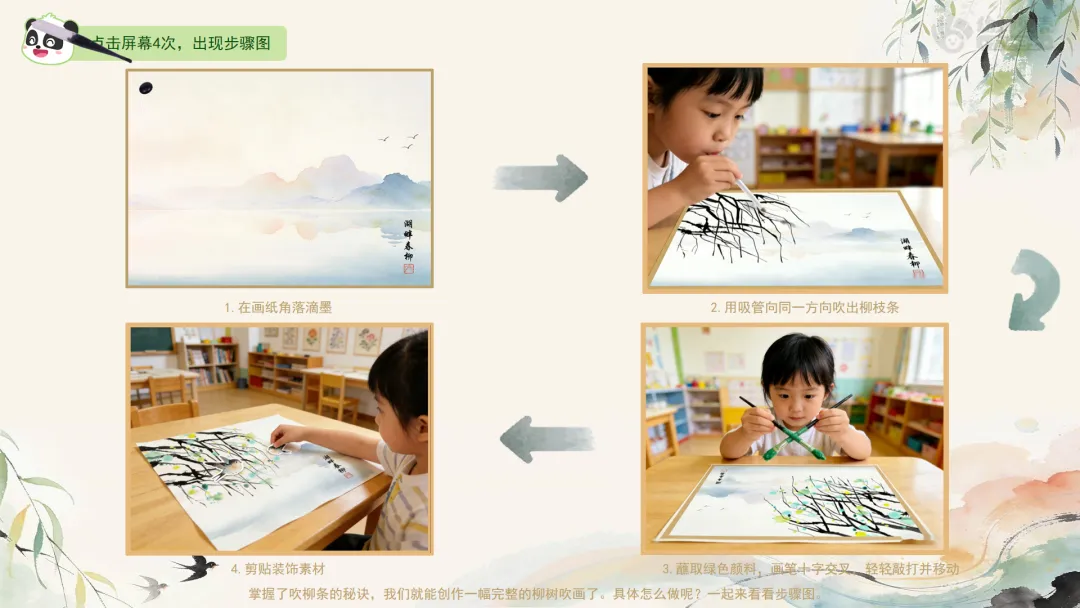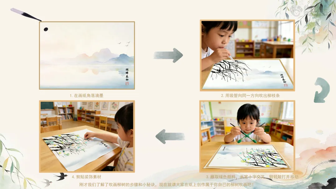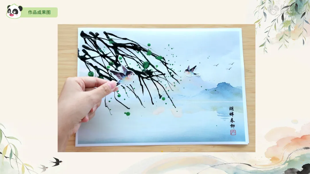 Ø活动建议: 1.教师可为幼儿作品拍照,并现场使用AI生成柳枝随风摇曳的动态效果进行展示,以增强其对画面动态美的体验。2.生成指令可参考:生成一段童趣水墨动画:画面中,柳枝柔软垂下,在春风中轻盈摇曳;树下的小燕子翩翩飞舞,蝴蝶翅膀微微扇动,画面整体充满天真活泼的动感,循环播放。