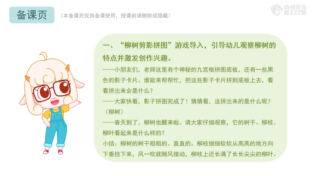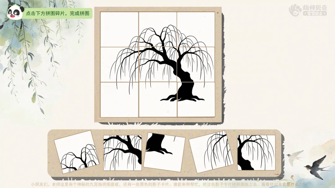 一、“柳树剪影拼图”游戏导入,引导幼儿观察柳树的特点并激发创作兴趣。