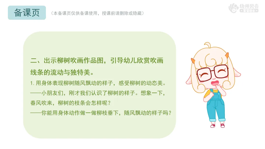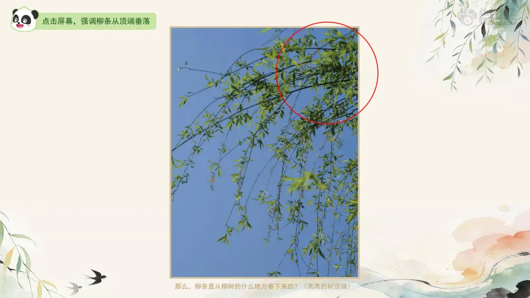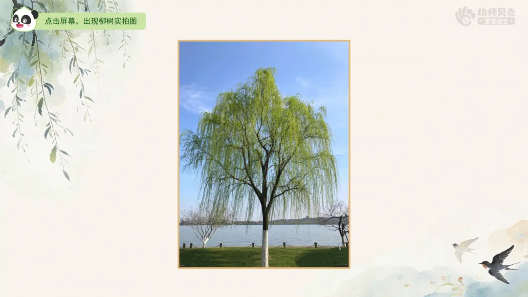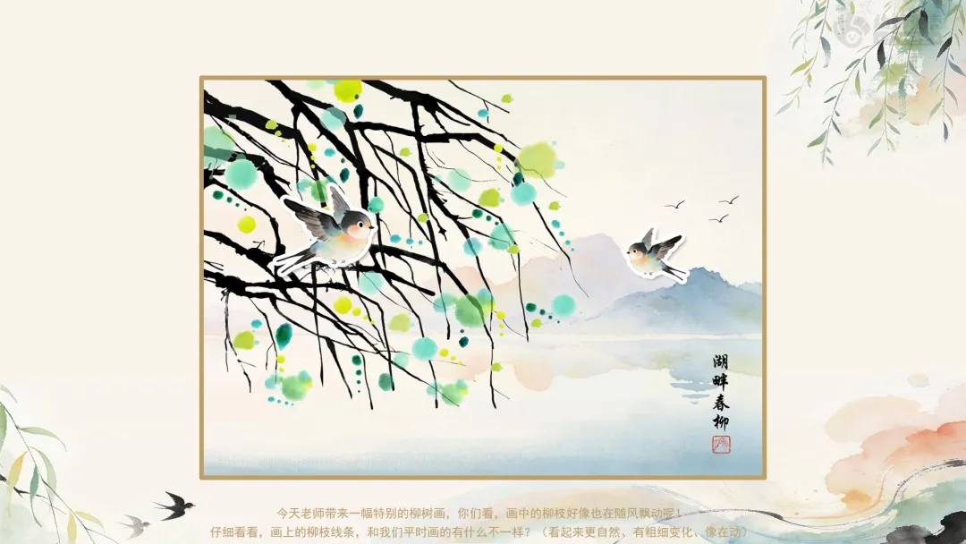 ——今天老师带来一幅特别的柳树画,你们看,画中的柳枝好像也在随风飘动呢!