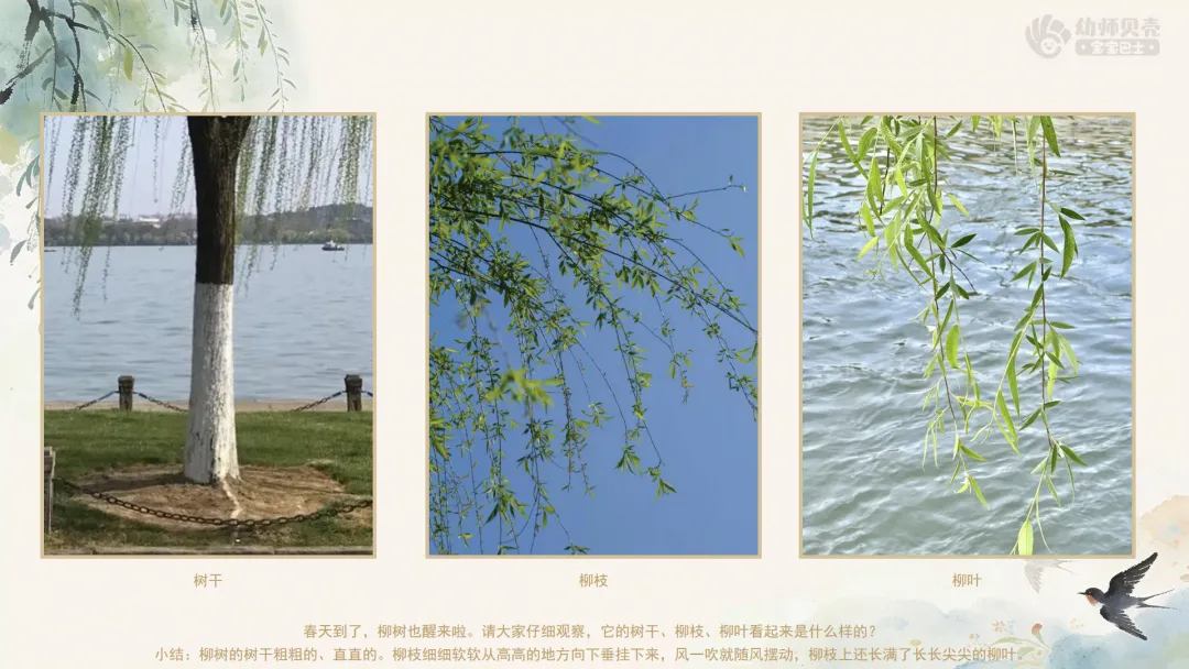 ——春天到了,柳树也醒来啦。请大家仔细观察,它的树干、柳枝、柳叶看起来是什么样的?