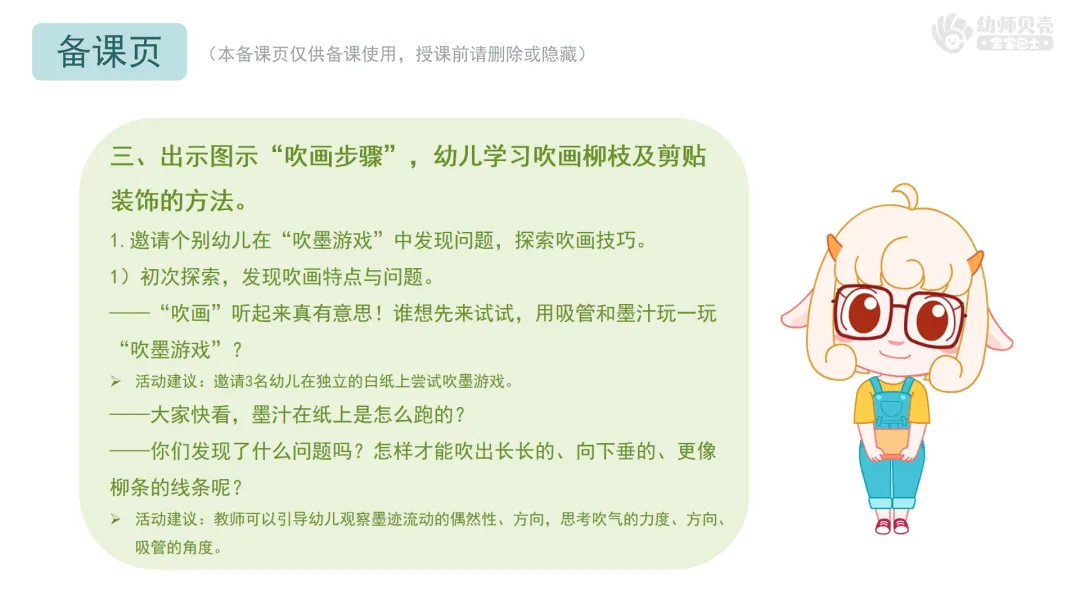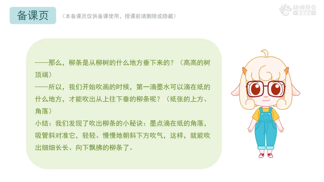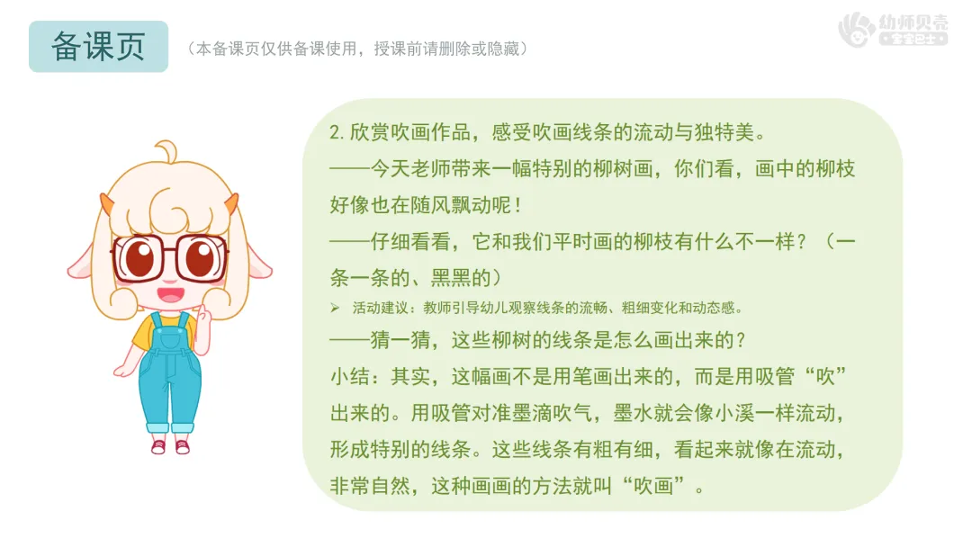 l尝试用吸管吹墨的方式表现柳树的垂柳,并能用剪贴的方法进行装饰。