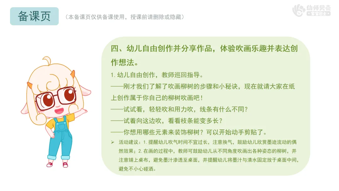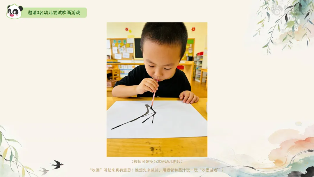 Ø活动建议:1.提醒幼儿吹气时间不宜过长,注意换气,鼓励幼儿欣赏墨迹流动的偶然效果;2.在画的过程中,教师可鼓励幼儿从不同角度吹画出各种姿态的柳树,并注意铺上桌布,避免墨汁渗透至桌面,并提醒幼儿将墨汁与清水固定放于桌面中间,避免不小心碰洒。