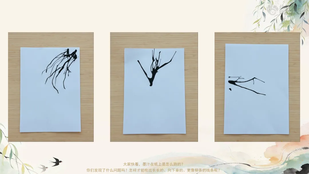 小结:我们发现了吹出柳条的小秘诀:墨点滴在纸的角落,吸管斜对准它,轻轻、慢慢地朝斜下方吹气,这样,就能吹出细细长长、向下飘拂的柳条了。