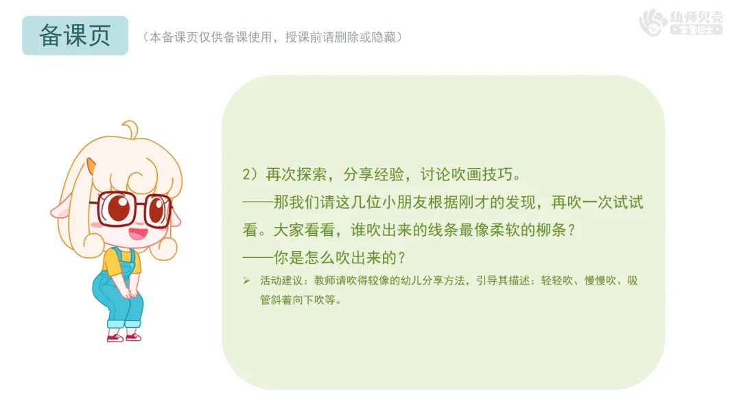 Ø活动建议:教师请吹得较像的幼儿分享方法,引导其描述:轻轻吹、慢慢吹、吸管斜着向下吹等。