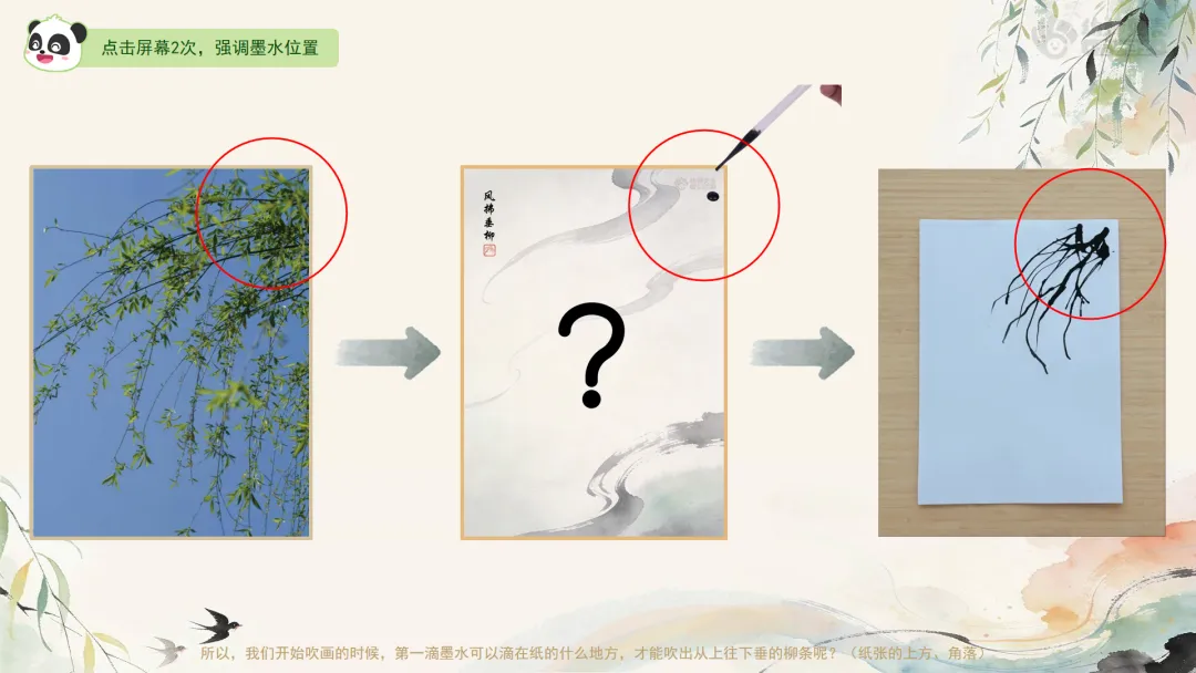 ——所以,我们开始吹画的时候,第一滴墨水可以滴在纸的什么地方,才能吹出从上往下垂的柳条呢?(纸张的上方、角落)