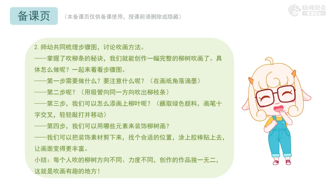 2.师幼共同梳理步骤图,讨论吹画方法。