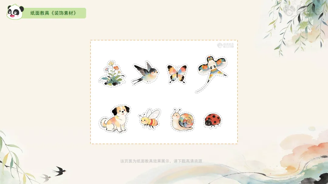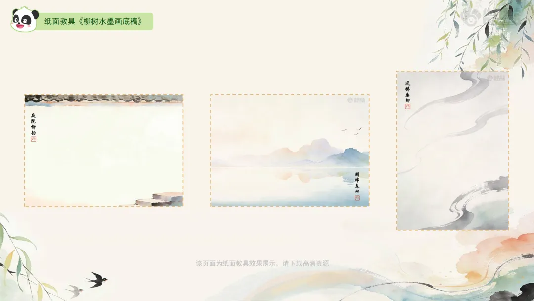 l纸面教具:《柳树水墨画底稿》《装饰素材》。