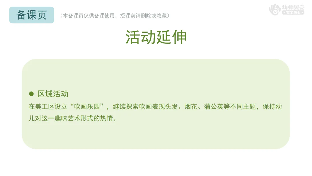 在美工区设立“吹画乐园”,继续探索吹画表现头发、烟花、蒲公英等不同主题,保持幼儿对这一趣味艺术形式的热情。