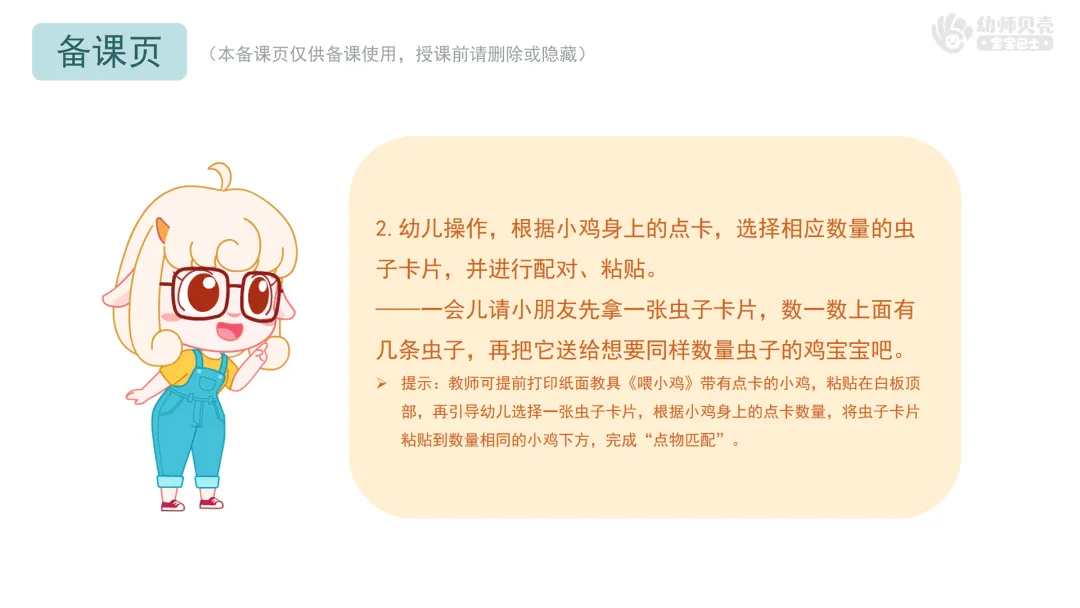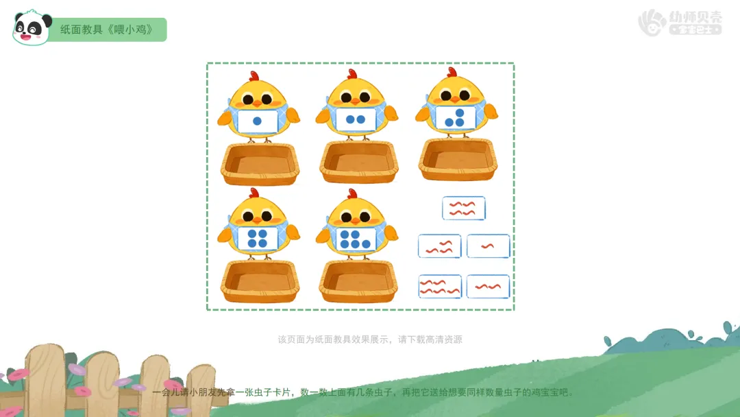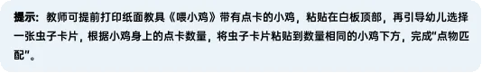 1.喂小鸡——出示纸面教具《喂小鸡》,点数点卡上点子数量和盘子里小虫数量,进行匹配。