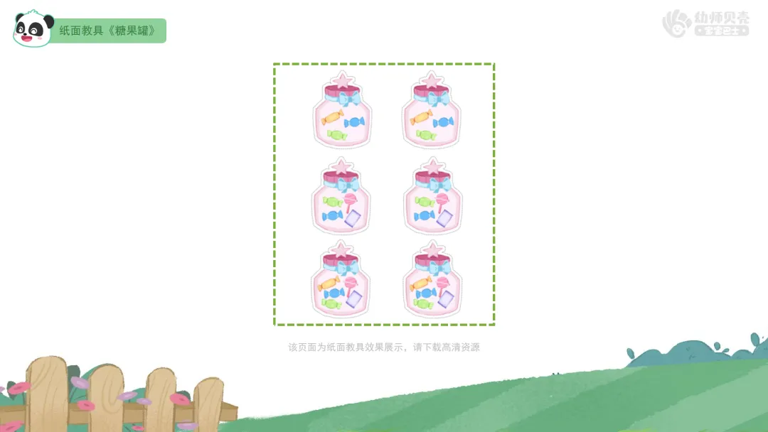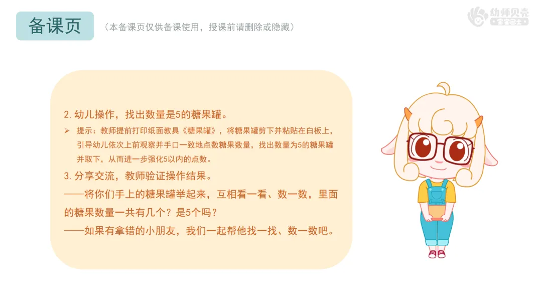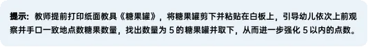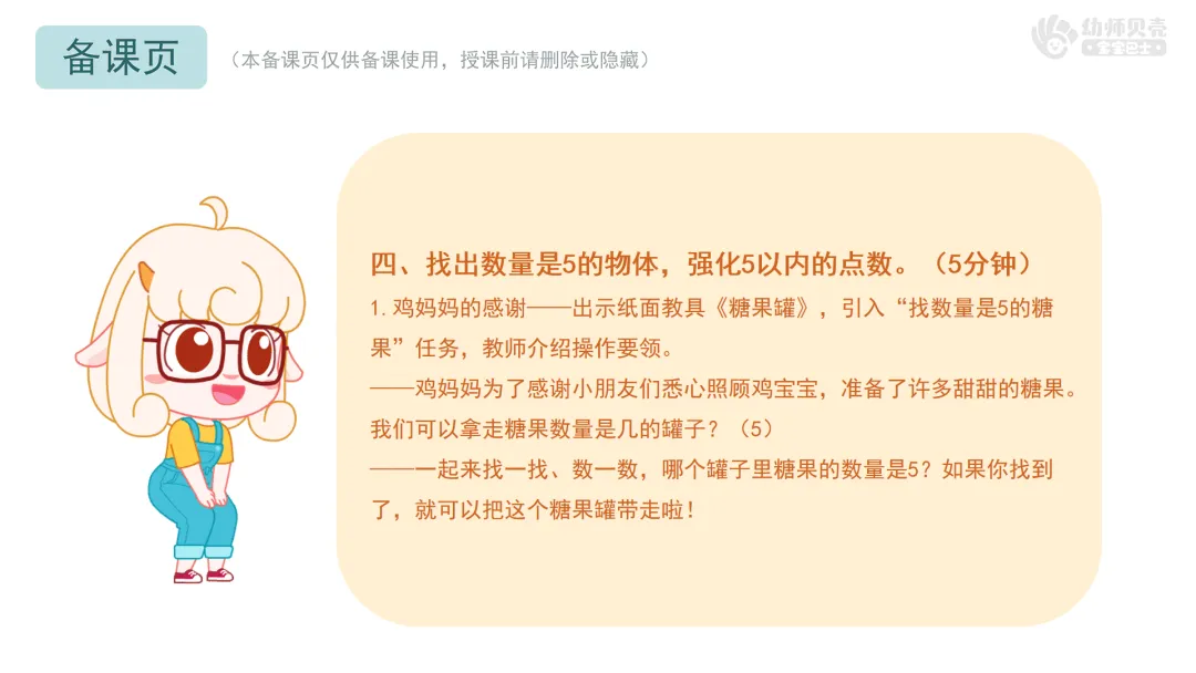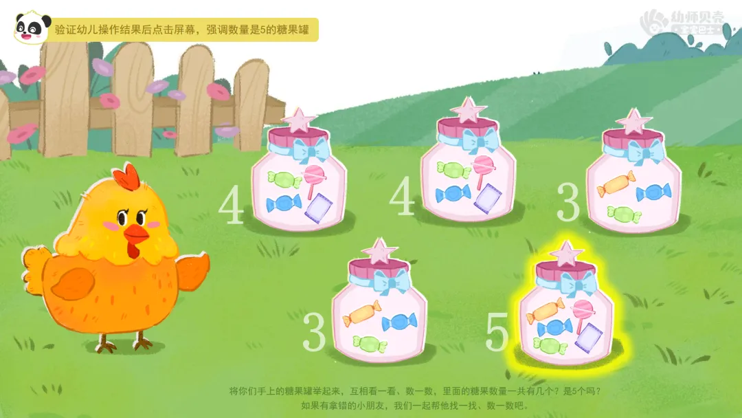 找出数量是5的物体,强化5以内的点数。(5分钟)1.出示纸面教具《糖果罐》,引入“找数量是5的糖果”任务,教师介绍操作要领。 ——鸡妈妈为了感谢小朋友们悉心照顾鸡宝宝,准备了许多甜甜的糖果。我们可以拿走糖果数量是几的罐子?(5) ——一起来找一找、数一数,哪个罐子里糖果的数量是5?如果你找到了,就可以把这个糖果罐带走啦! 2.幼儿操作,找出数量是5的糖果罐。 3.分享交流,教师验证操作结果。 ——将你们手上的糖果罐举起来,互相看一看、数一数,里面的糖果数量一共有几个?是5个吗? ——如果有拿错的小朋友,我们一起帮他找一找、数一数吧。