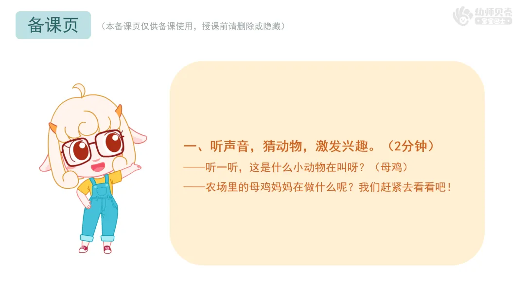一、听声音,猜动物,激发兴趣。(2分钟) ——听一听,这是什么小动物在叫呀?(母鸡)