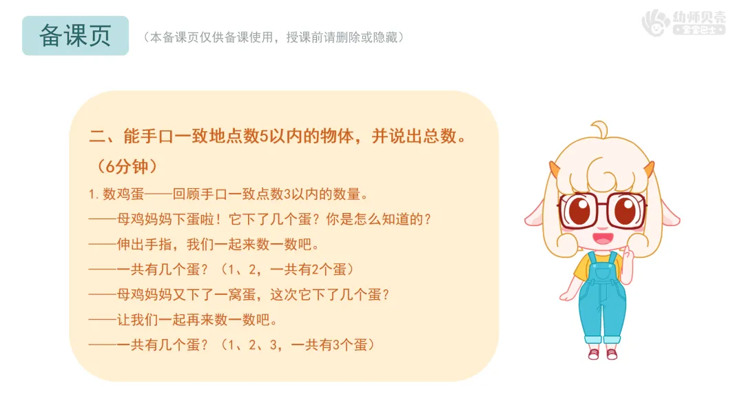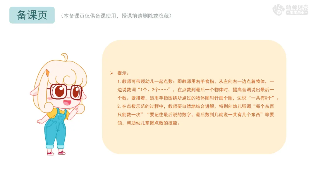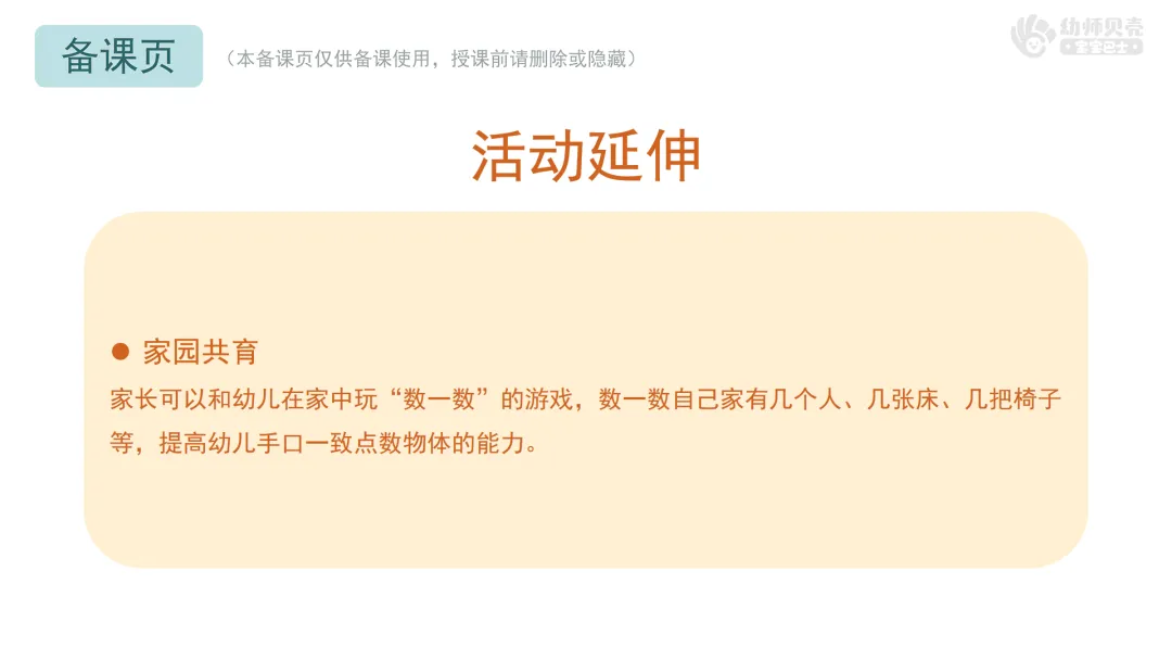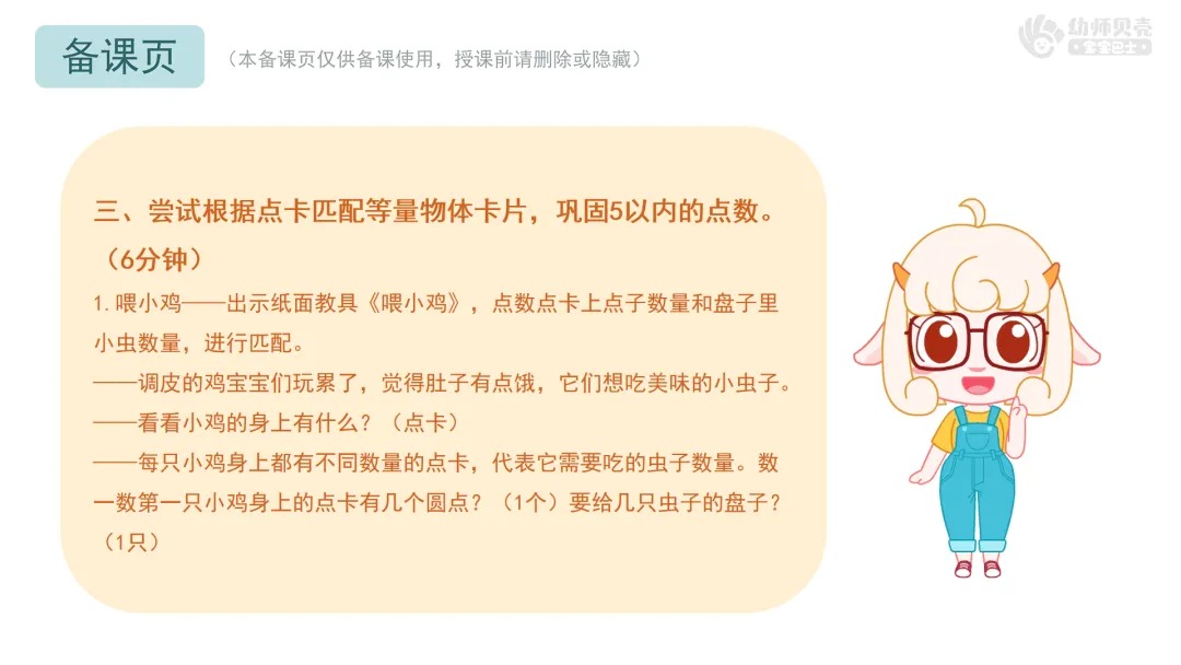 l经验准备:幼儿已掌握3以内的点数。(建议优先开展幼师贝壳数学活动《3以内的点数》作为经验铺垫)