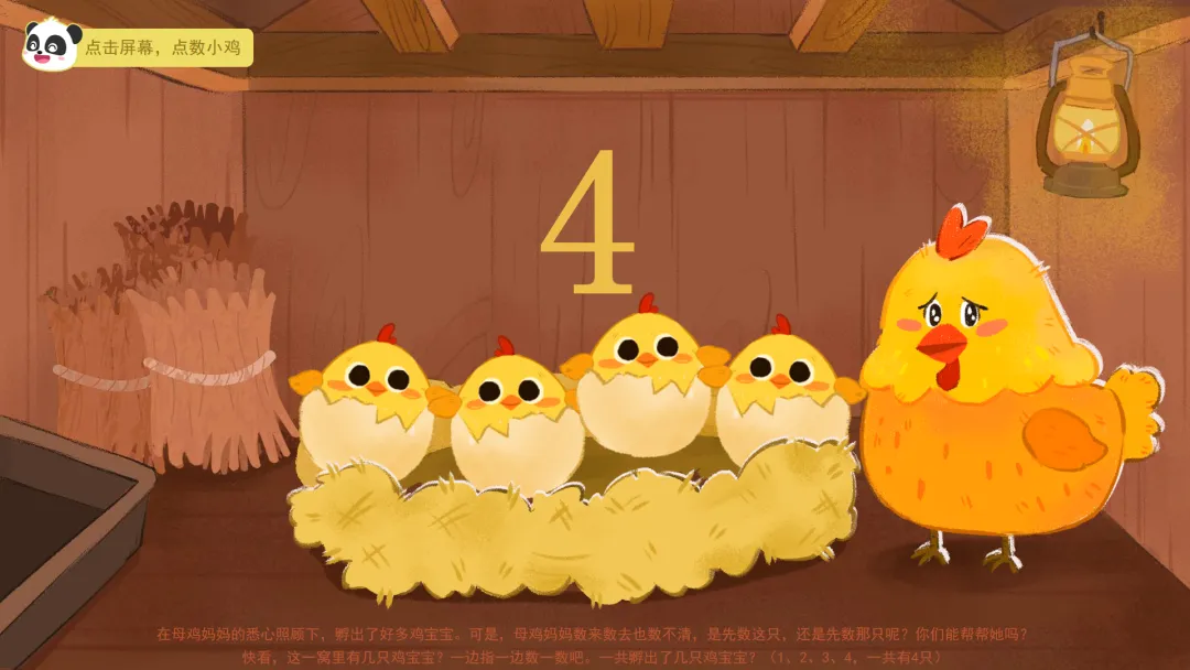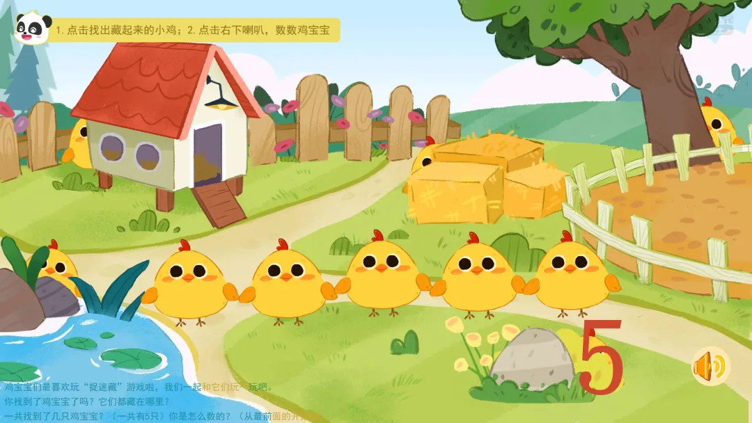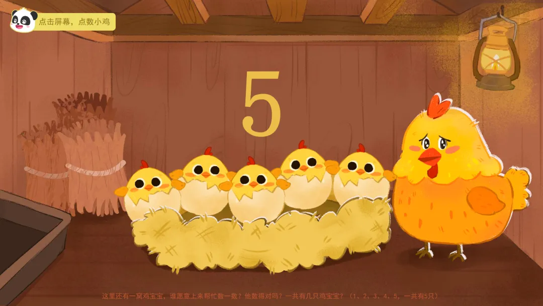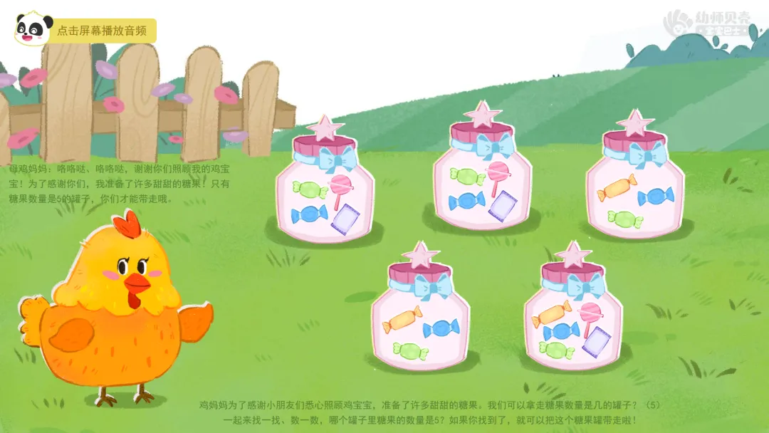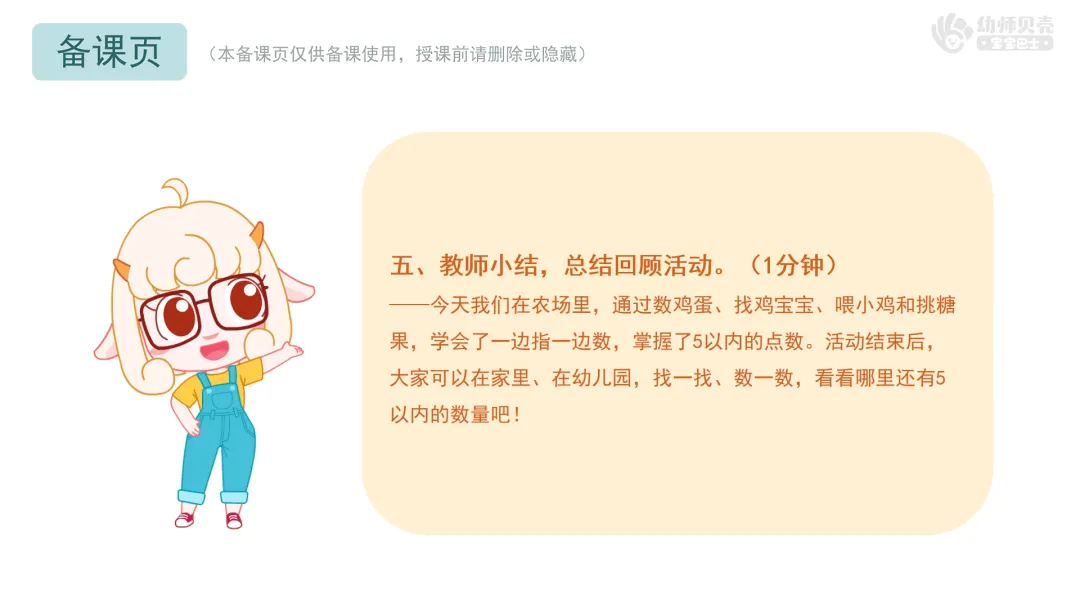 ——今天我们在农场里,通过数鸡蛋、找鸡宝宝、喂小鸡和挑糖果,学会了一边指一边数,掌握了5以内的点数。活动结束后,大家可以在家里、在幼儿园,找一找、数一数,看看哪里还有5以内的数量吧!