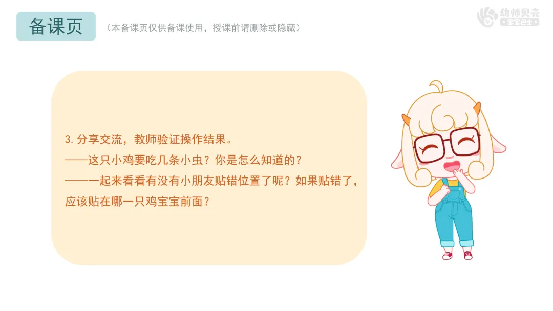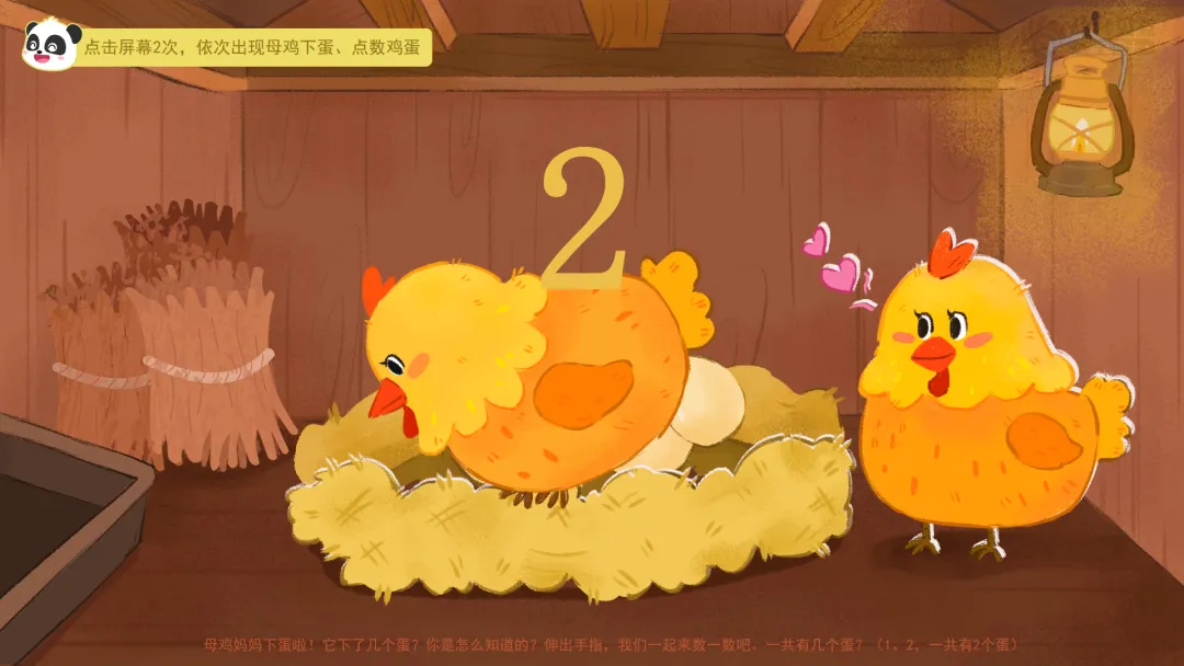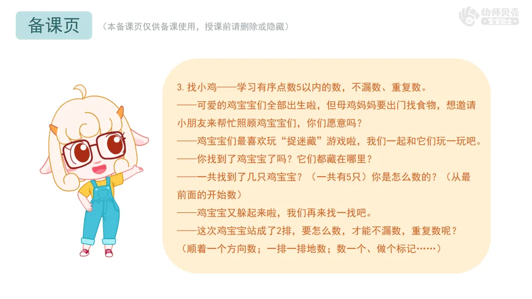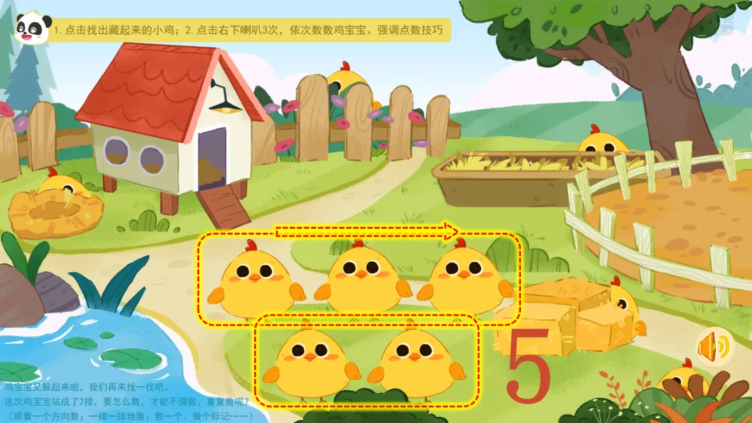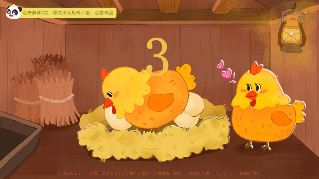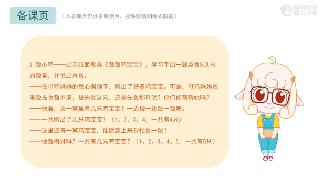 ——今天我们在农场里,通过数鸡蛋、找鸡宝宝、喂小鸡和挑糖果,学会了一边指一边数,掌握了5以内的点数。活动结束后,大家可以在家里、在幼儿园,找一找、数一数,看看哪里还有5以内的数量吧!