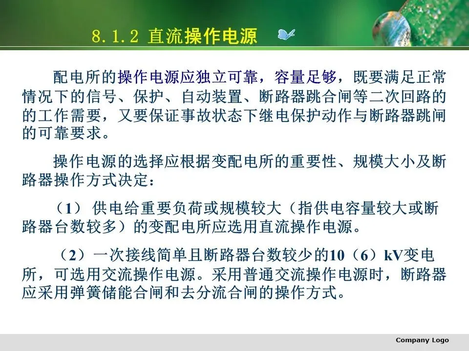(1) 供电给重要负荷或规模较大(指供电容量较大或断路器台数较多)的变配电所应选用直流操作电源。