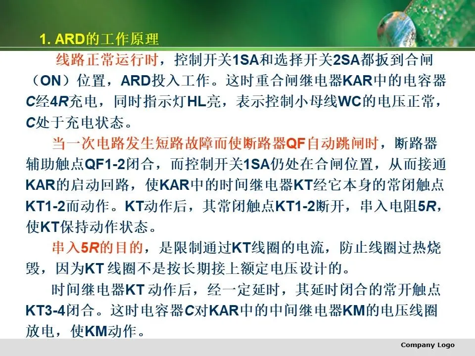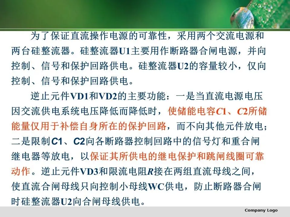 逆止元件VD1和VD2的主要功能:一是当直流电源电压因交流供电系统电压降低而降低时,使储能电容C1、C2所储能量仅用于补偿自身所在的保护回路,而不向其他元件放电;二是限制C1、C2向各断路器控制回路中的信号灯和重合闸继电器等放电,以保证其所供电的继电保护和跳闸线圈可靠动作。逆止元件VD3和限流电阻R接在两组直流母线之间,使直流合闸母线只向控制小母线WC供电,防止断路器合闸时硅整流器U2向合闸母线供电。