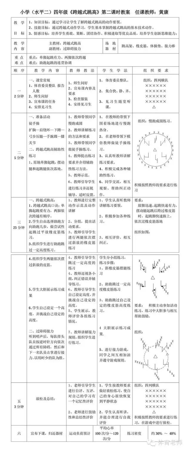 2、教材作用:跨越式跳高是小学跳跃类教材,本课跨越式教学是水平二(跳跃)单元教学中的的第一课时,是在原来水平一各种跳基础上的巩固与提升,跨越式跳高作起来灵活、轻巧、连贯,符合小学生的身心特点,易于教学,锻炼身体的价值比较高,学生也乐于学。通过教学,能发展学生柔韧、灵敏、协调素质和基本活动能力,提高学生控制身体的平衡能力。对于培养学生勇敢、顽强、团结拼搏的优良品质具有促进作用。