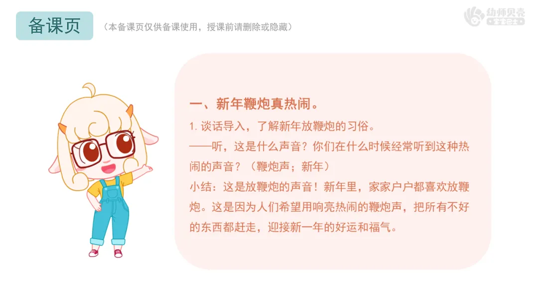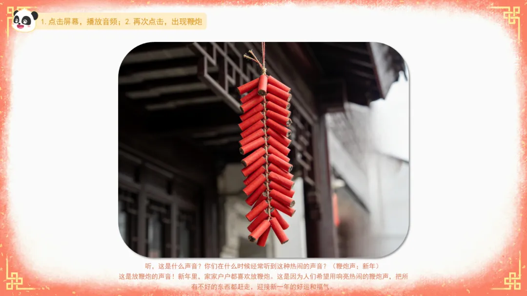 小结:这是放鞭炮的声音!新年里,家家户户都喜欢放鞭炮。这是因为人们希望用响亮热闹的鞭炮声,把所有不好的东西都赶走,迎接新一年的好运和福气。