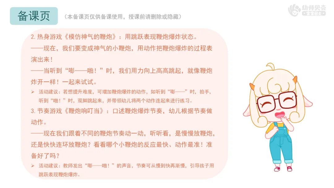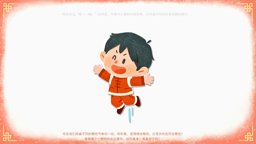 ——现在我们跟着不同的鞭炮节奏动一动,听听看,是慢慢放鞭炮,还是快快连环放鞭炮?看看哪个小鞭炮的反应最快、动作最准!准备好了吗?