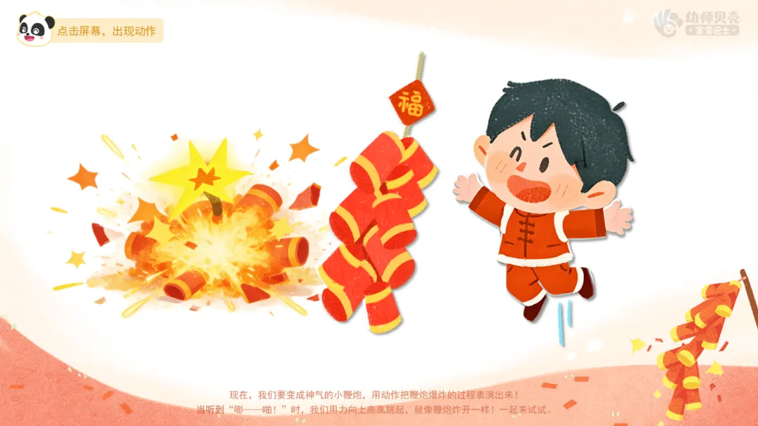 ——当听到“嘭——啪!”时,我们用力向上高高跳起,就像鞭炮炸开一样!一起来试试。