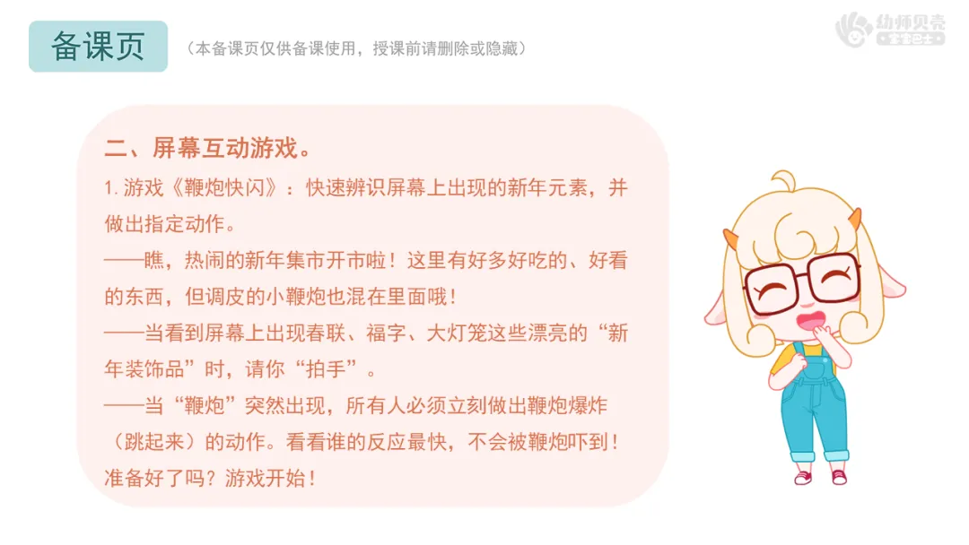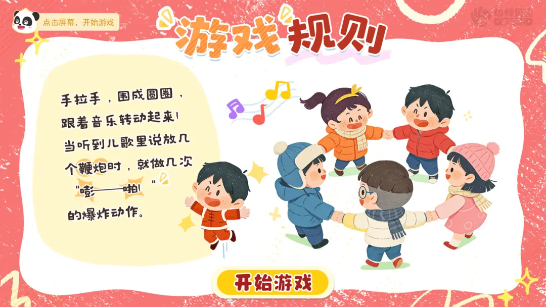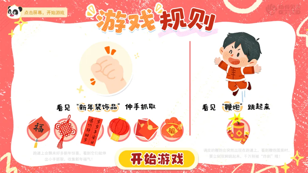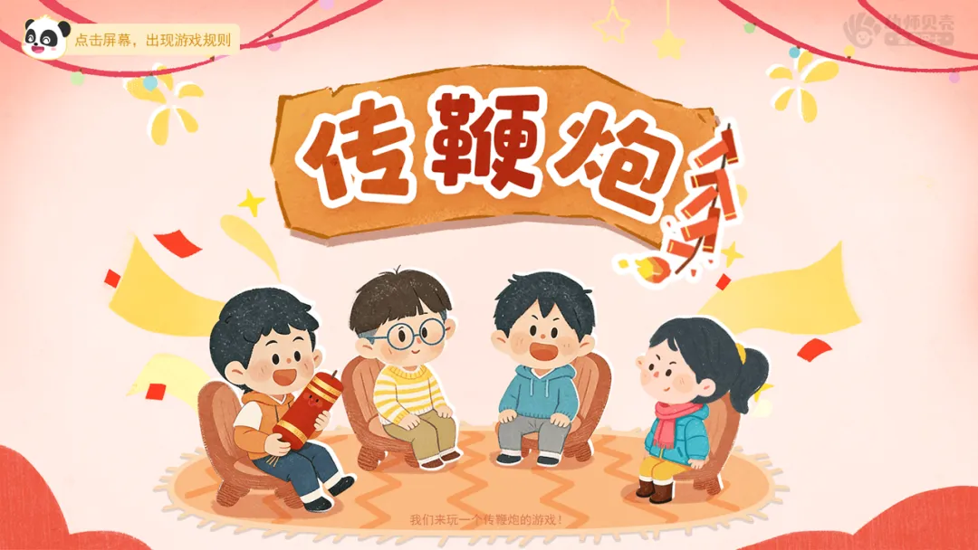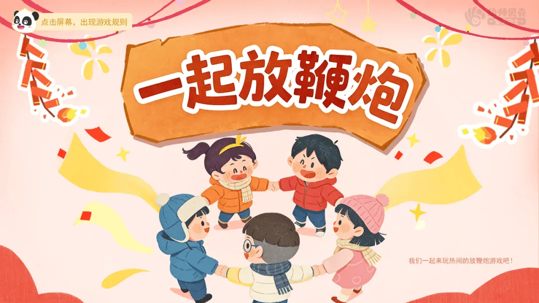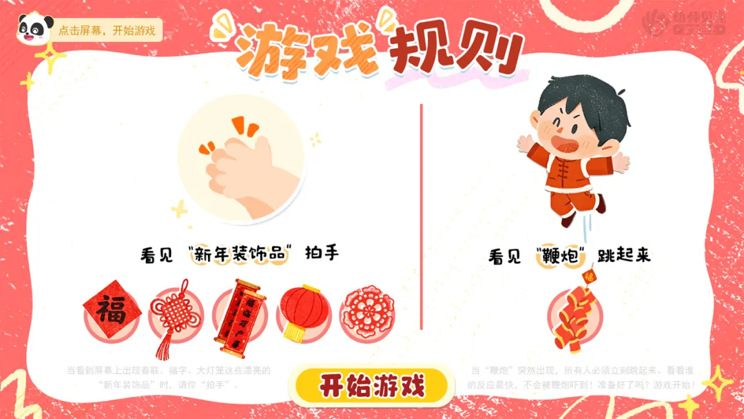 ——当“鞭炮”突然出现,所有人必须立刻做出鞭炮爆炸(跳起来)的动作。看看谁的反应最快,不会被鞭炮吓到!准备好了吗?游戏开始!