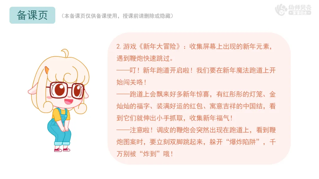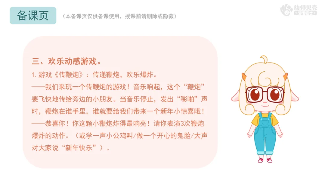 (本资源共包含4个新年鞭炮游戏活动,教师可配合PPT使用,并根据本班幼儿情况自行删减、增加或者调整游戏内容及资源)
