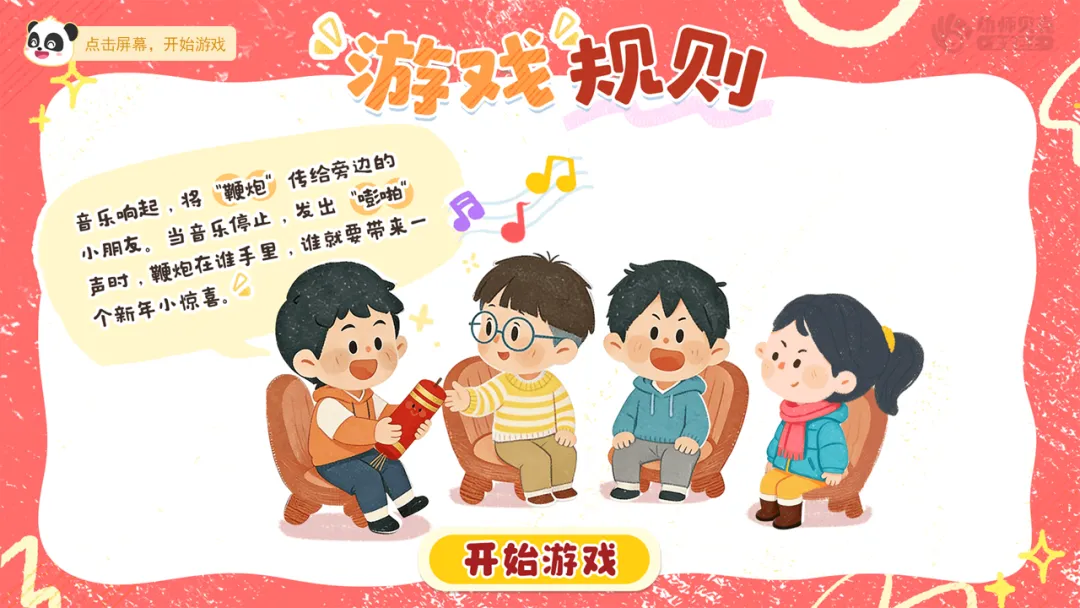 ——我们来玩一个传鞭炮的游戏!音乐响起,这个“鞭炮”要飞快地传给旁边的小朋友。当音乐停止,发出“嘭啪”声时,鞭炮在谁手里,谁就要给我们带来一个新年小惊喜哦!